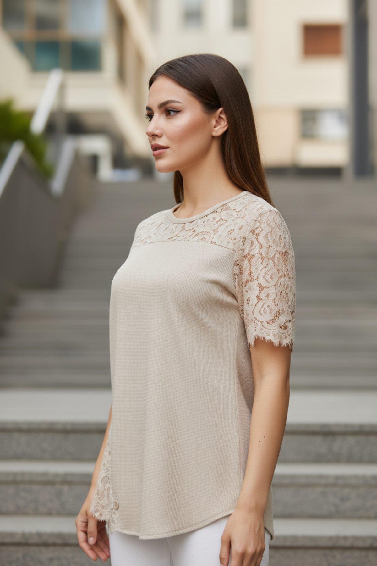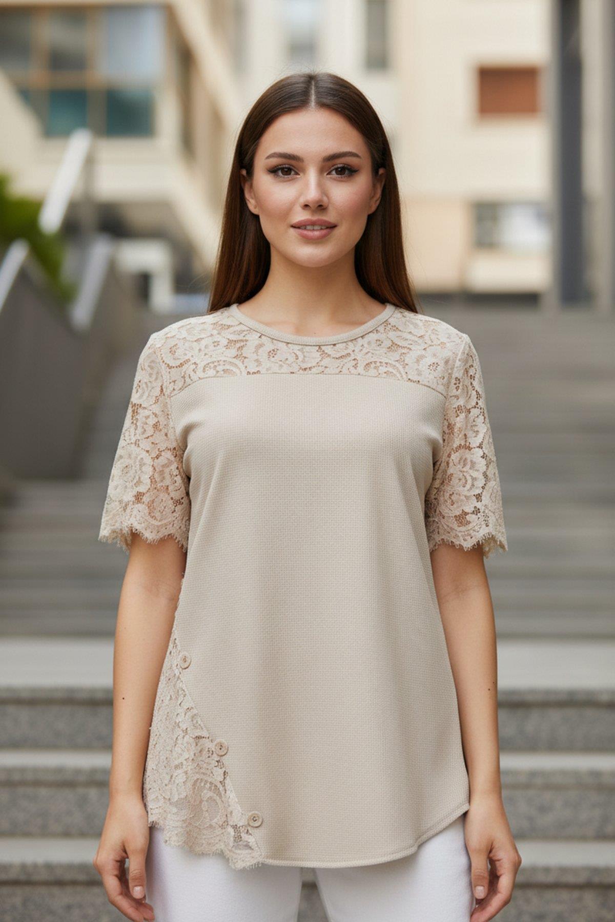 Günlük şıklığınızı bir üst seviyeye taşıyacak olan bu Dantel Detaylı Kısa Kollu Bluz, romantik dokunuşları modern kesimle birleştiriyor. Omuz ve kol kısımlarında yer alan asil dantel işlemeleri, etek ucundaki düğme ve dantel asimetrisi ile birleşerek benzersiz bir silüet oluşturuyor. Hem ofis kombinlerinizde hem de özel davetlerde zahmetsiz şıklığın anahtarı olacak.