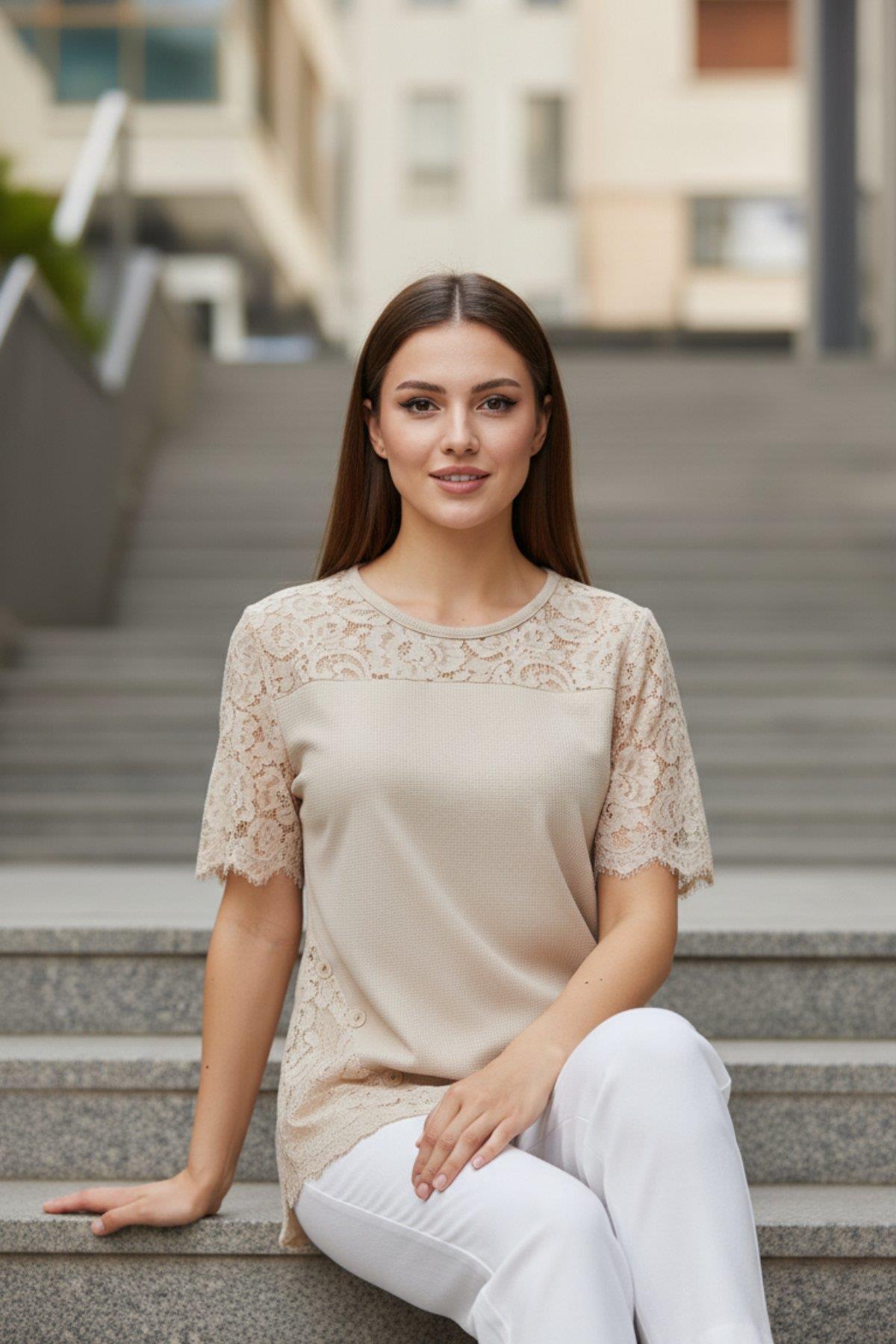 • Tasarım: Bisiklet yaka, omuz ve kollarda transparan dantel geçişleri.