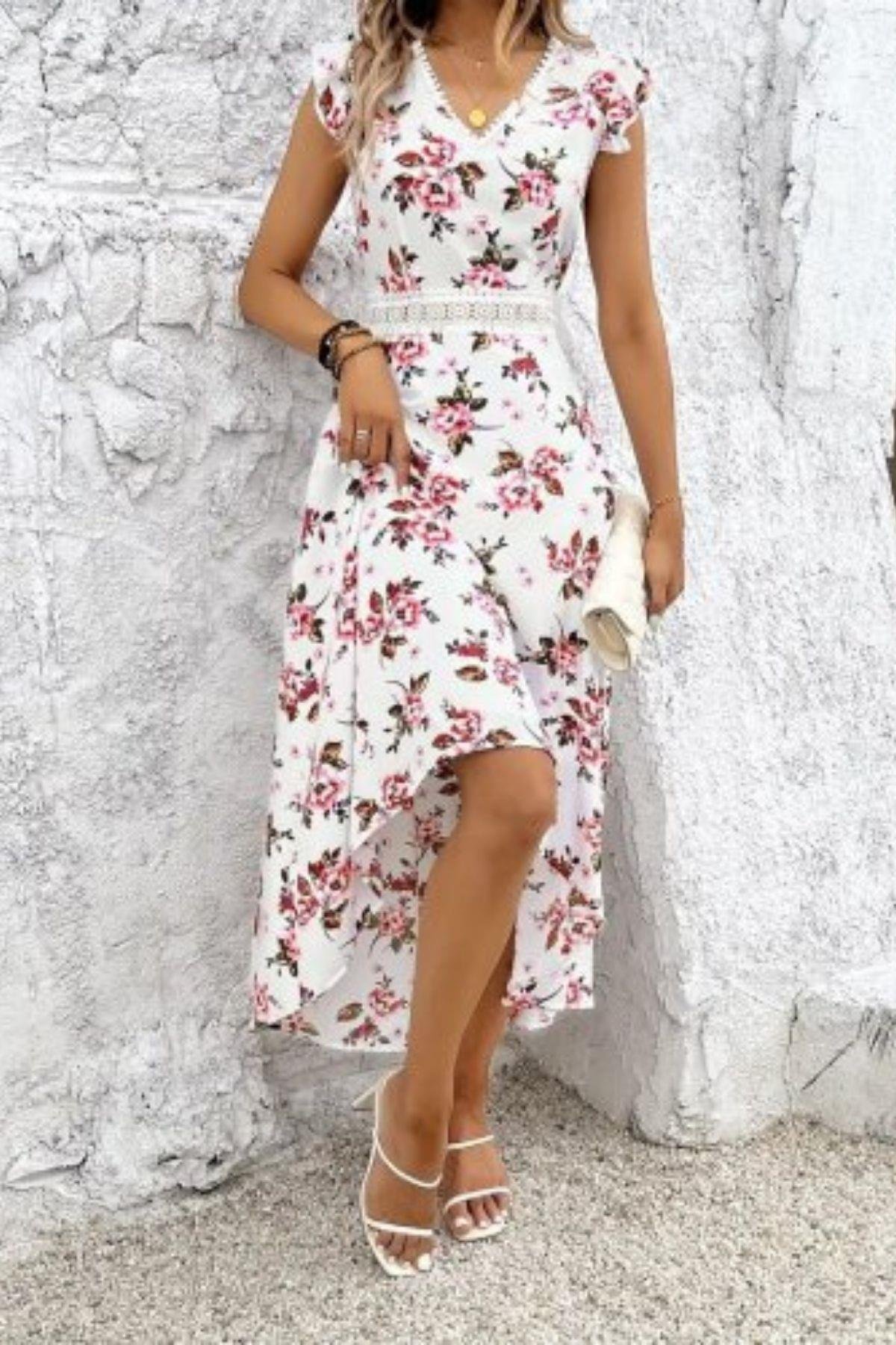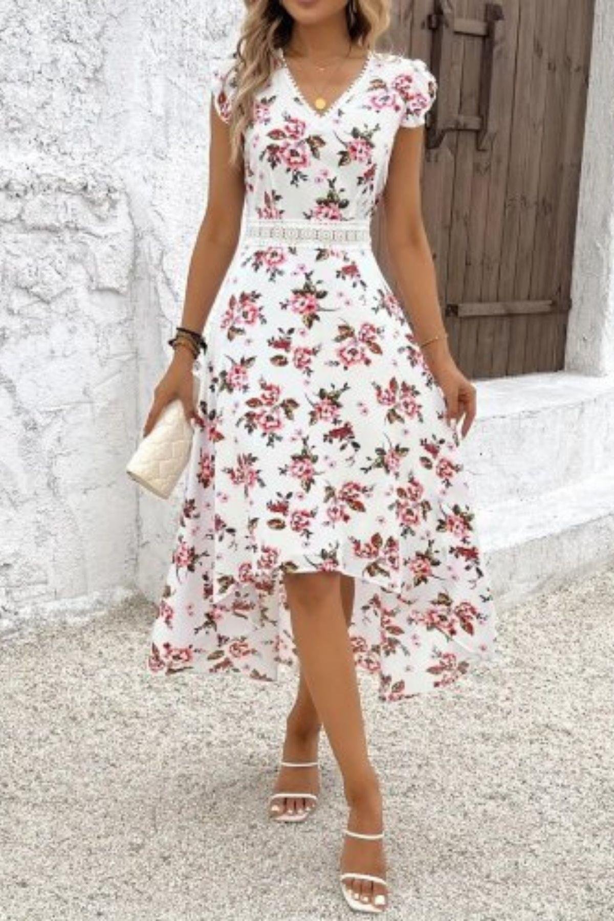Yazın romantik esintisini üzerinizde taşıyın! Çiçek desenleriyle bezenmiş, asimetrik kesimli midi elbisemizle her anınızda zarafeti yakalayın. Hafif ve uçuş uçuş kumaşı sayesinde sıcak günlerde bile maksimum konfor sunarken, V yaka detayı ve beldeki zarif dantel işlemelerle feminen bir dokunuş katıyor. Önden kısa, arkadan uzun kesimiyle hareketli ve modern bir görünüm yaratırken, her türlü yaz etkinliği için ideal bir seçimdir. Sandaletlerinizle, topuklu ayakkabılarınızla veya spor ayakkabılarınızla kombinleyerek farklı stiller yaratabileceğiniz bu elbise, gardırobunuzun en şık parçalarından biri olmaya aday.