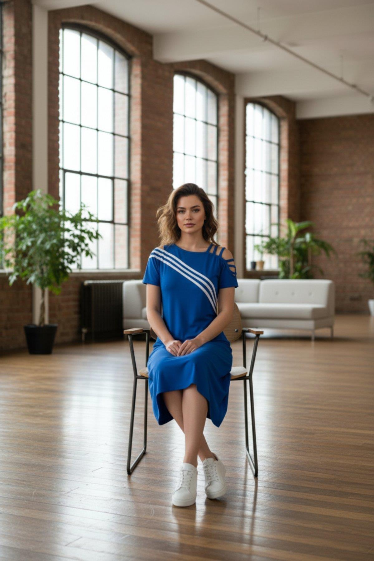 • Sportif Şeritler: Göğüs hizasından geçen kontrast üçlü şerit garnisi, elbiseye dinamik ve enerjik bir hava katar.