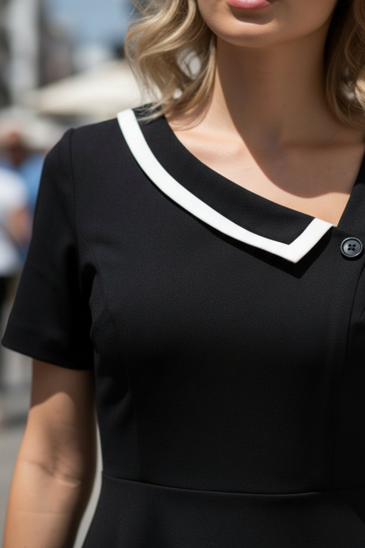 • Detay: Yaka kısmında estetik düğme aksesuarı.