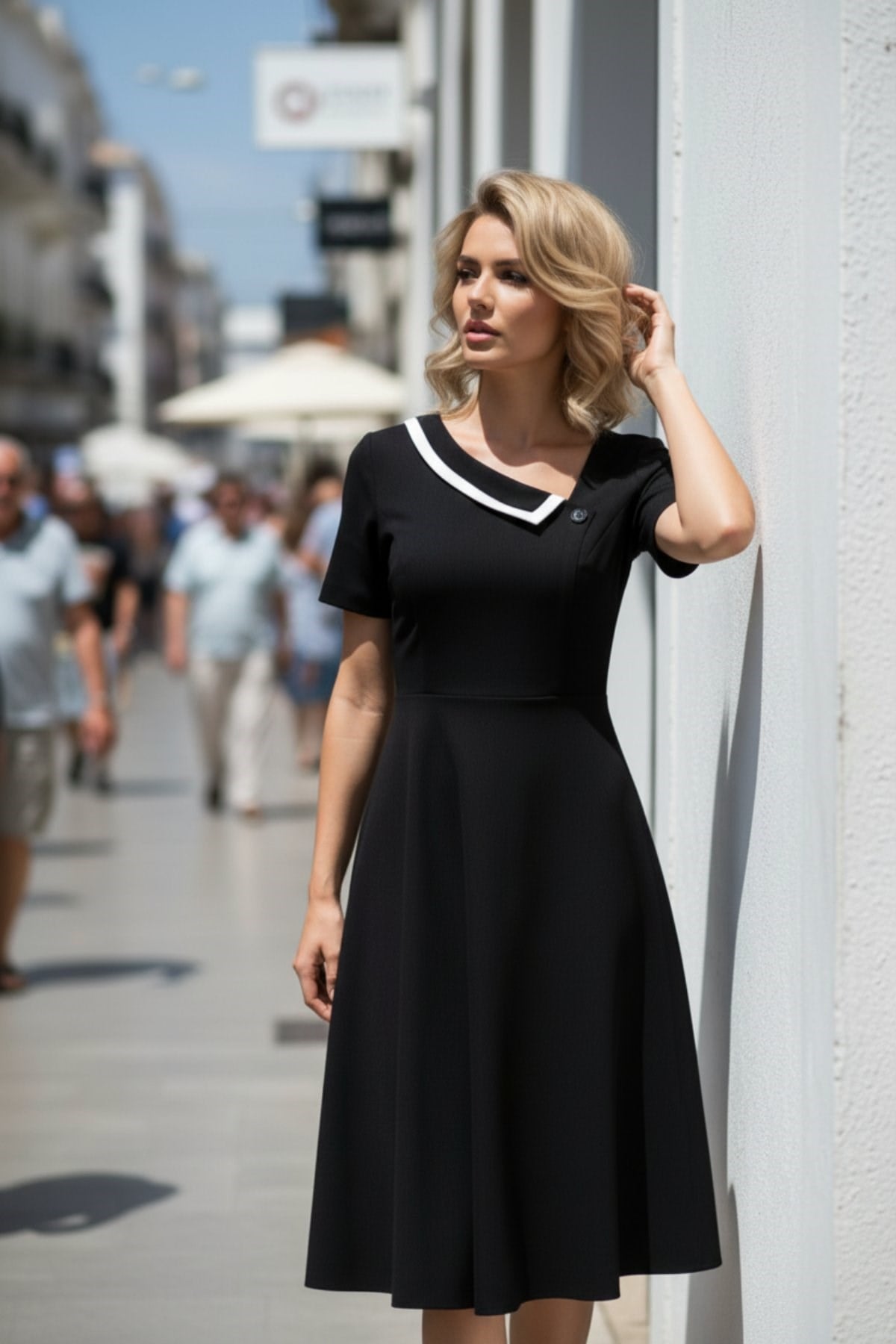 Zarafeti ve modern tasarım anlayışını tek bir parçada buluşturan bu özel elbise, gardırobunuzun en joker parçalarından biri olmaya aday. Klasik marin stilinden ilham alan asimetrik yaka tasarımı, kontrast biye detayları ve zarif düğme dokunuşuyla hareketlendirilmiştir. Bel hattını naifçe vurgulayan kesimi, aşağı doğru dökümlü gelen kloş eteğiyle birleşerek her vücut tipinde kusursuz bir silüet oluşturur.
