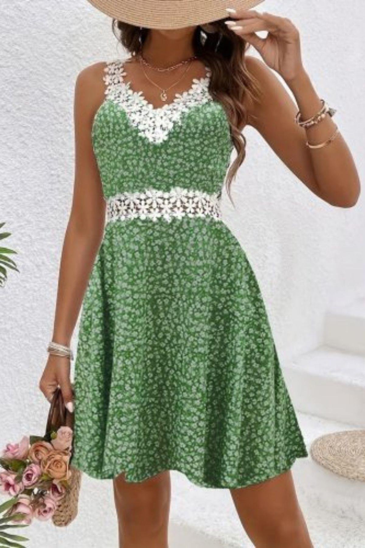 Askılı Çiçek Desenli Dantel Detaylı Elbise - Yeşil