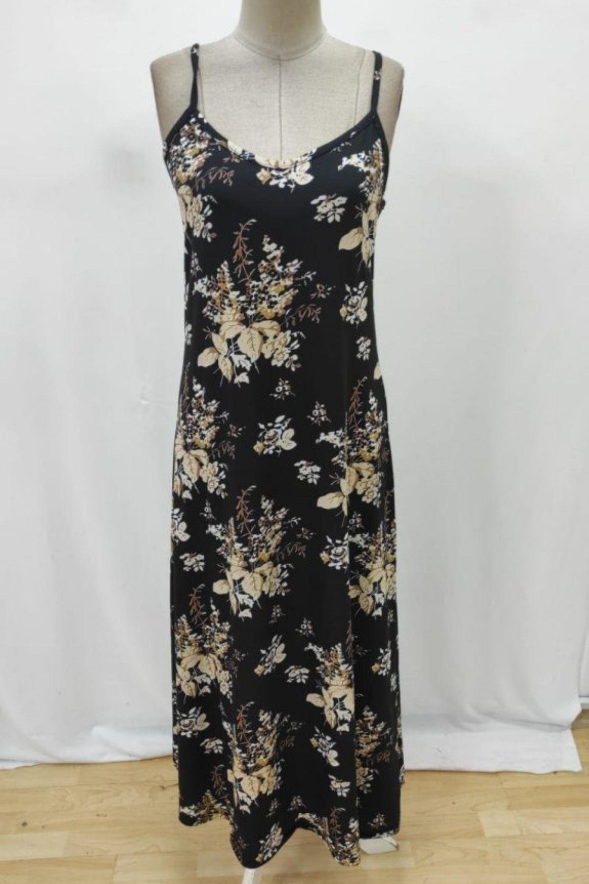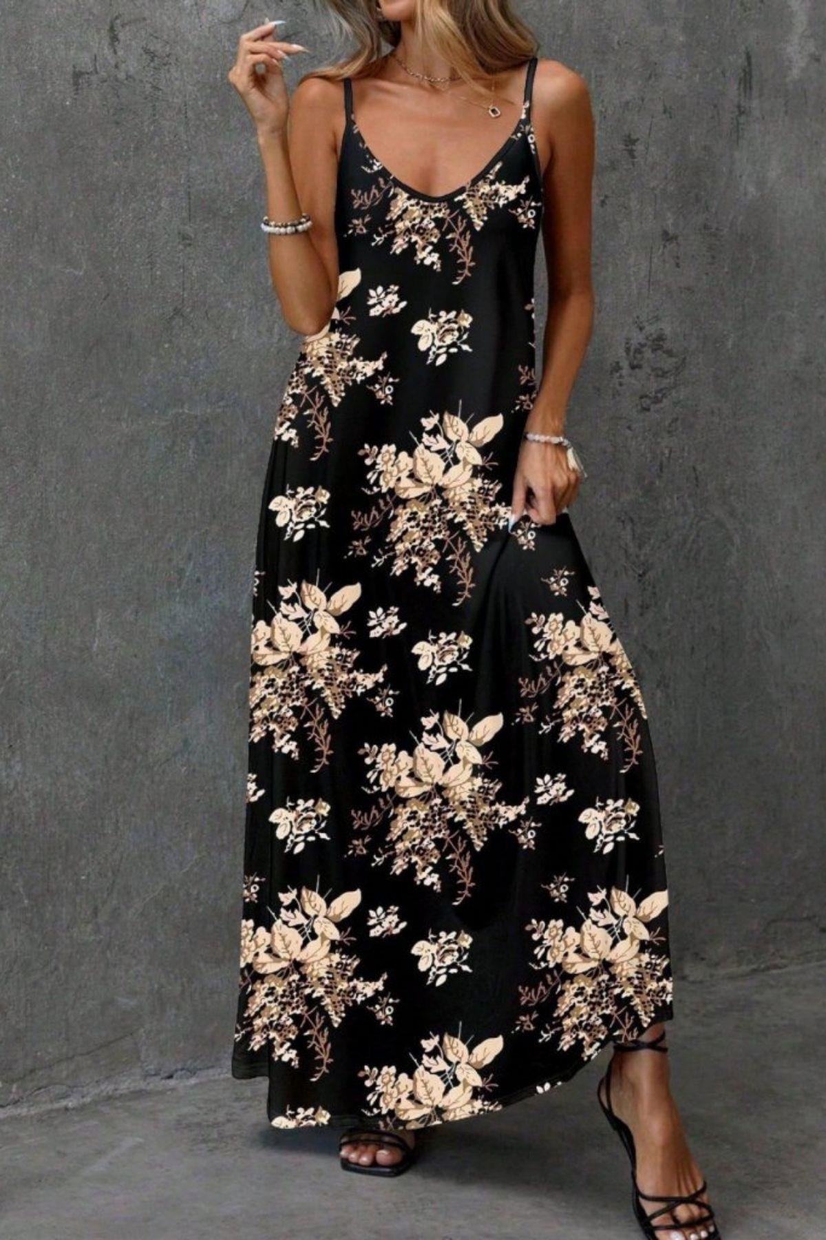 Askılı Çiçek Desenli Uzun Yazlık Süprem  Elbise - Siyah