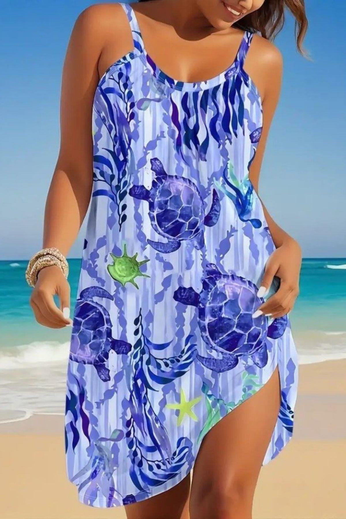 Sıcak yaz günlerinin enerjisini yansıtan bu elbise, canlı desenleri ve rahat kesimiyle öne çıkıyor. Sevimli kaplumbağa figürleri ve deniz esintili çizgili deseniyle tatil stilinize neşe katın. Kolsuz ve V yaka tasarımı, hem şıklık hem de ferahlık sunar. Esnek ve hafif kumaşı sayesinde gün boyu rahat bir kullanım sağlar. İster sahil kenarında, ister şehirde bir kafede, bu elbise ile her zaman dikkat çekici ve neşeli bir duruş sergileyin.