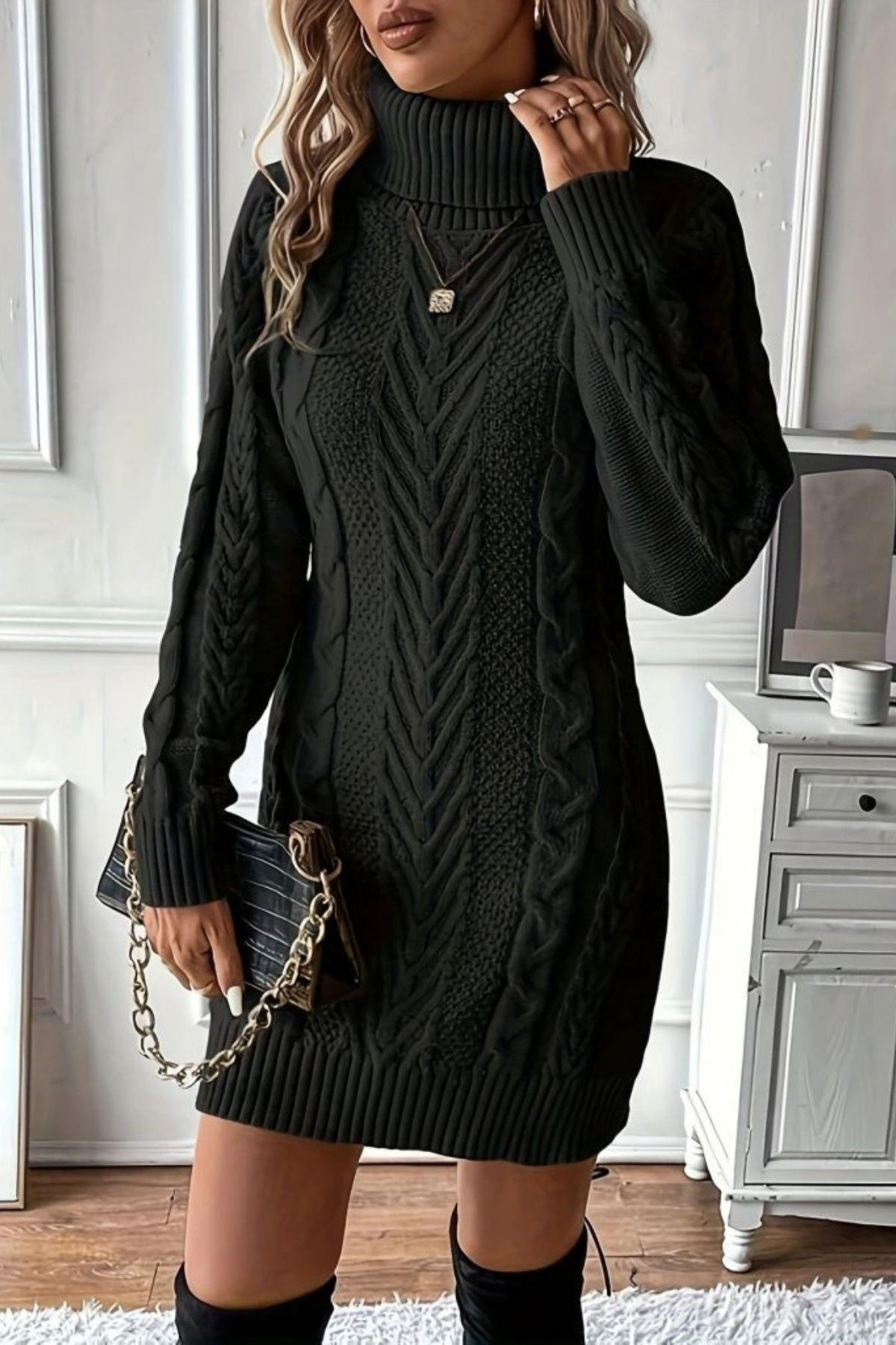 Balıkçı Yaka Saç Örgü Desenli Uzun Kollu Triko Mini Elbise