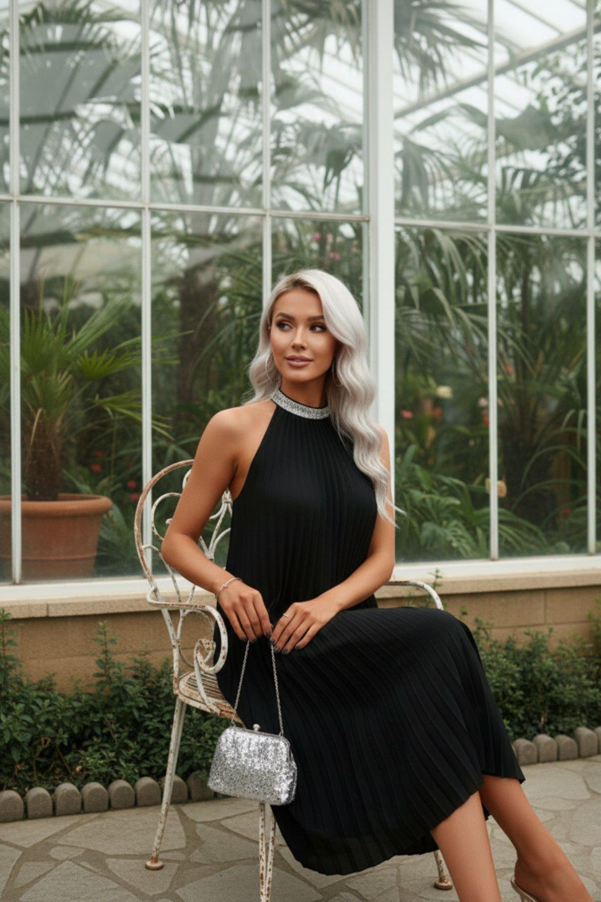 Zarafeti ve modern şıklığı bir araya getiren bu özel tasarım pileli elbise, özel davetlerin ve anlamlı günlerin vazgeçilmezi olmaya aday. Göz alıcı ışıltılı yaka detayı ile dikkatleri üzerinize çekerken, dökümlü pileli yapısı kusursuz bir silüet yaratır. Halter yaka kesimi omuzları zarifçe ön plana çıkarır, hafif ve rahat kumaşı ise gün boyu hareket özgürlüğü sunar. İster şık bir akşam yemeğinde isterseniz de özel bir kutlamada, topuklu ayakkabılar ve minimal aksesuarlarla kombinleyerek göz kamaştırıcı bir görünüme kavuşabilirsiniz. Gardırobunuzun en şık ve kurtarıcı parçası olmak için sizi bekliyor!