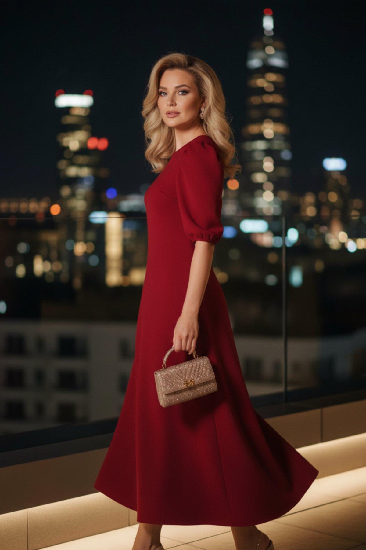Balon Kol Rahat Kesim Midi Krep Elbise - Kırmızı (JS98019-KIRMIZI)