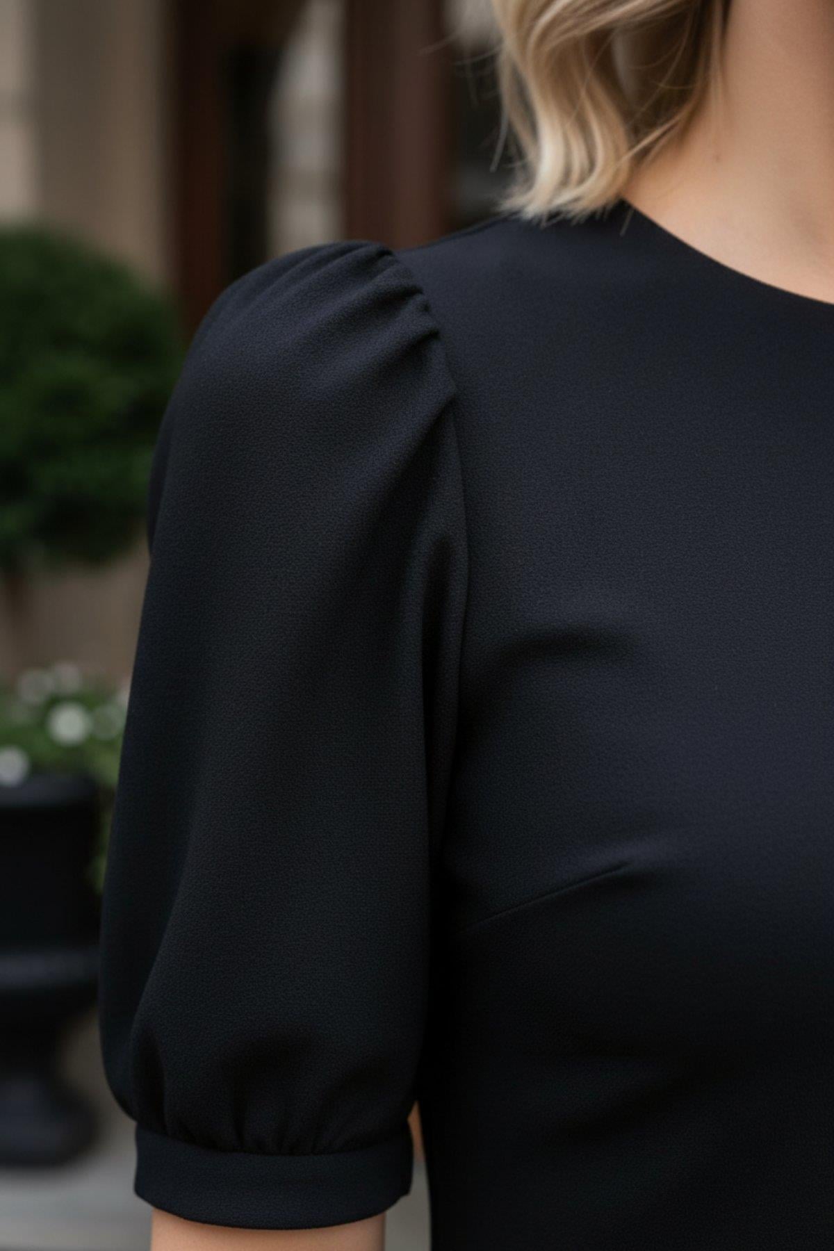 Balon Kol Rahat Kesim Midi Krep Elbise - Siyah