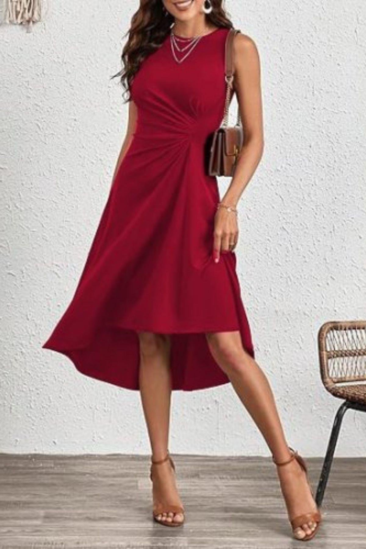 Zarafeti ve modernliği bir araya getiren bu asimetrik kesim midi elbise ile bakışları üzerinize çekin. Kloş etek yapısı ve ön kısmındaki drape detayı, feminen bir silüet sunarken, kolsuz tasarımıyla yaz günlerinde ve özel davetlerde rahatlık sağlar. Topuklu ayakkabılar ve minimal aksesuarlar ile kombinleyerek şıklığınızı tamamlayabilirsiniz.