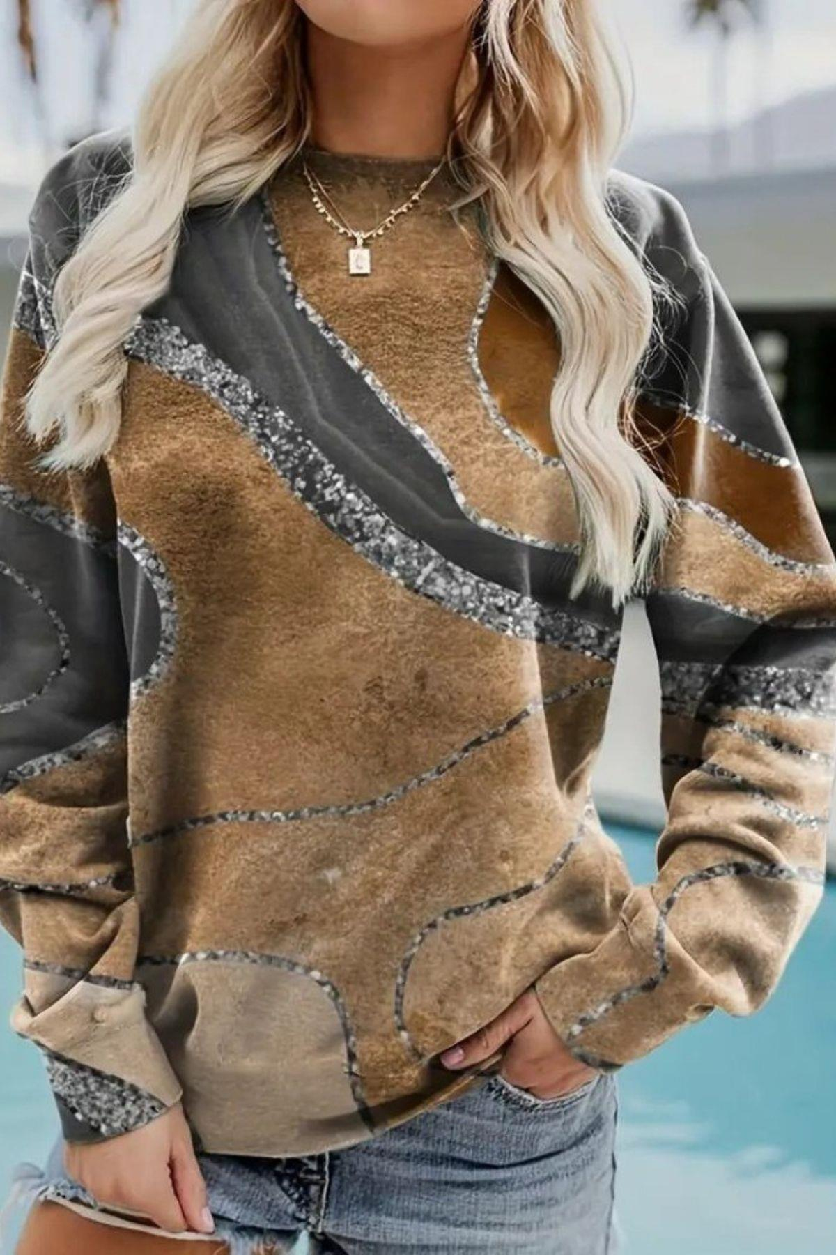 Gündelik stilinize sanatsal bir dokunuş katın! Bu abstrakt desenli uzun kollu bluz, modern çizgileri ve göz alıcı renk geçişleriyle sıradanlığın dışına çıkıyor. Yumuşak ve dökümlü kumaşı, gün boyu rahat bir kullanım sunarken, benzersiz deseniyle kombinlerinize anında karakter kazandırır. Jeanler, etekler veya taytlarla kolayca eşleştirerek şık ve rahat bir görünüm elde edebilirsiniz. Hem sonbahar hem de kış aylarında kurtarıcı parçanız olacak.