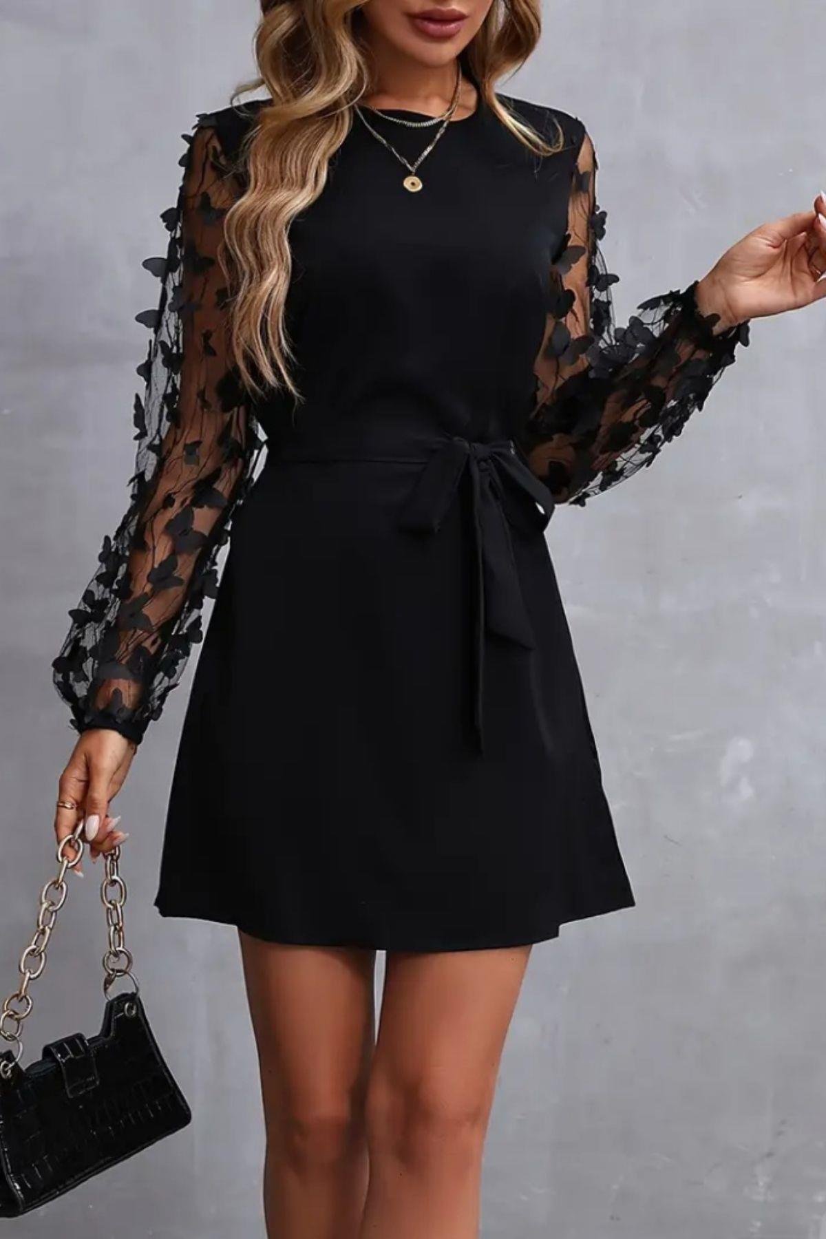 Bisiklet Yaka İthal Krep Tül Kelebek Kollu Mini Elbise - Siyah