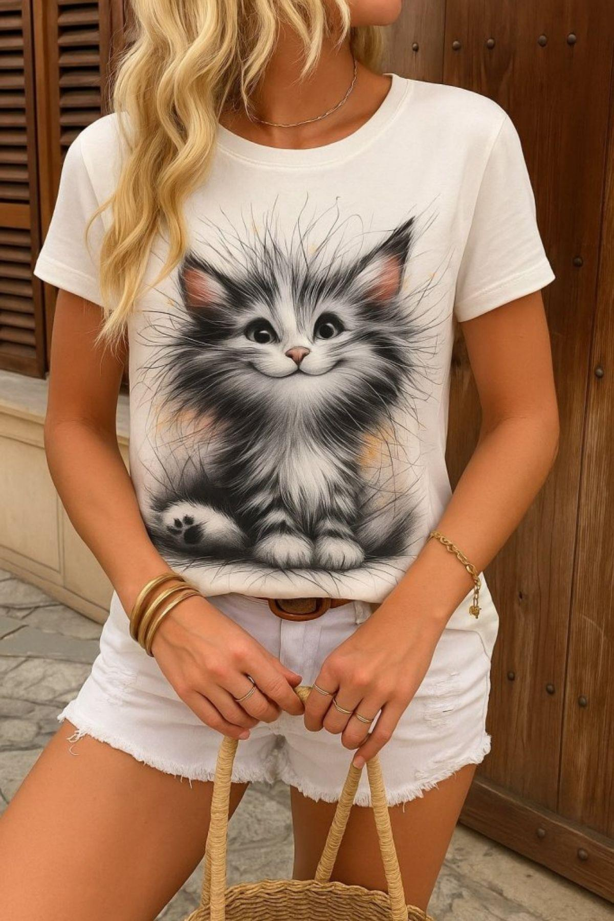 Gülümseten Şıklık: Sevimli Kedi Baskılı Pamuklu Tişört