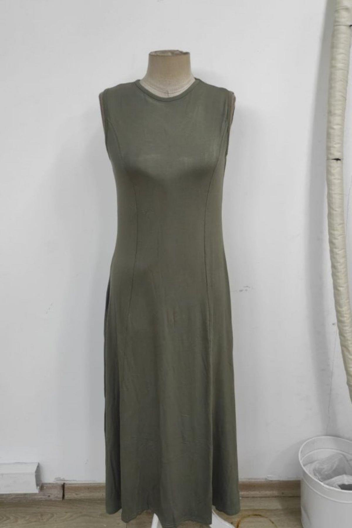 Bisiklet Yaka Kolsuz Uzun Viskon Elbise - Yeşil