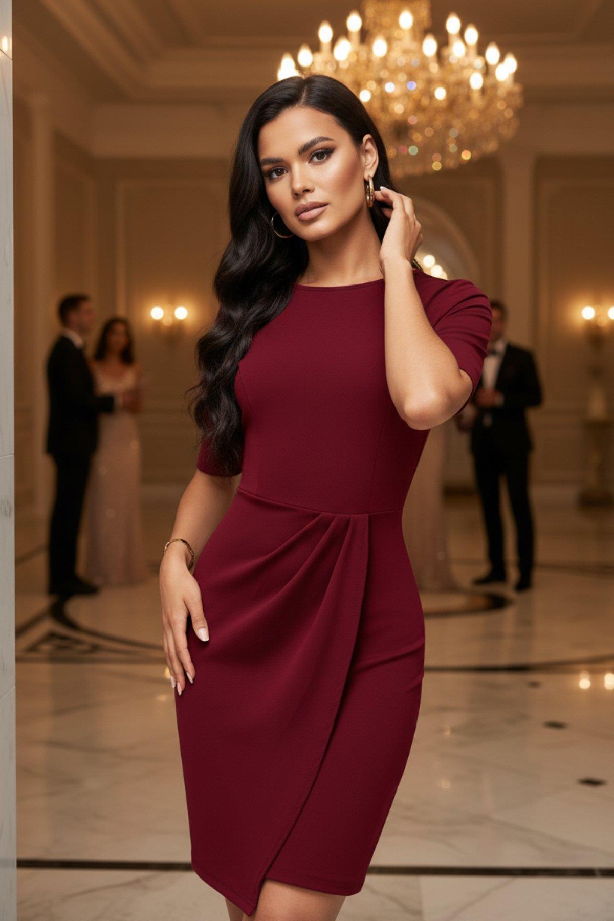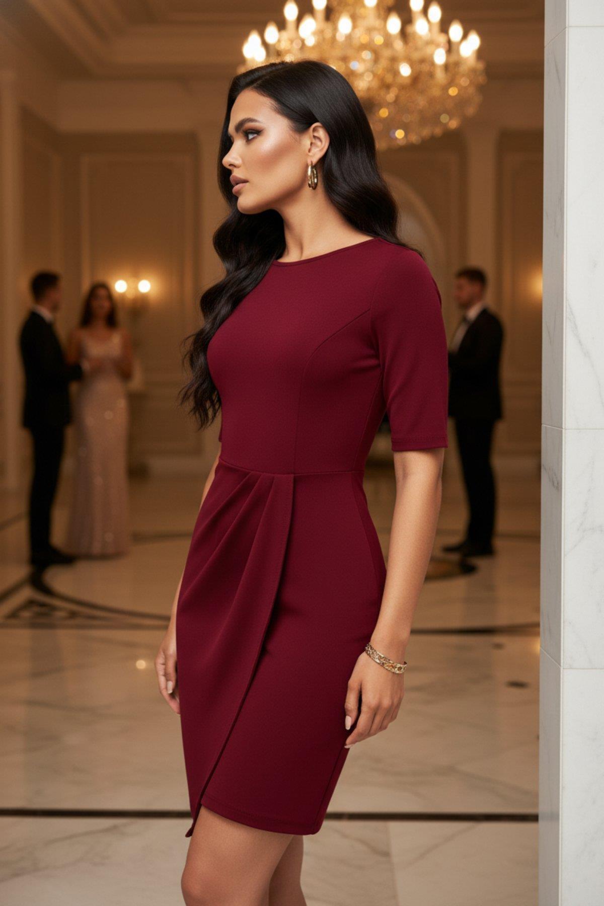 Zarafetin Modern Yorumu: Kruvaze Kesim Detaylı Kısa Kollu Davet Elbisesi