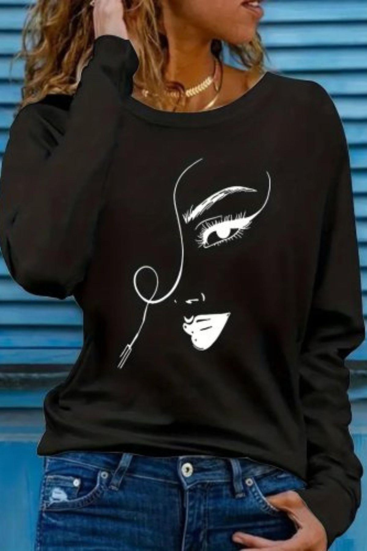 Bisiklet Yaka Yüz Desenli Viskon Bluz Siyah