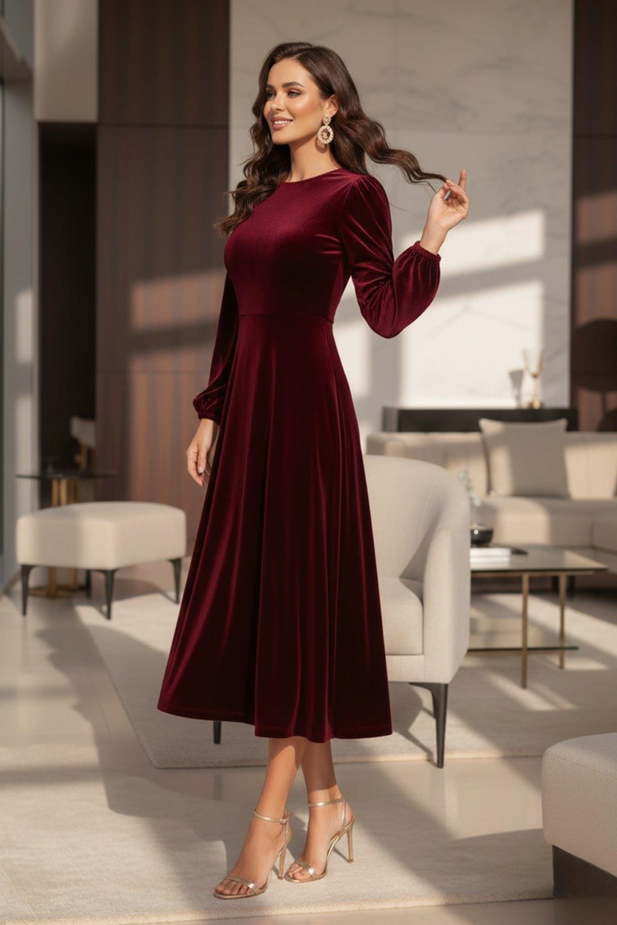 Zamansız bir zarafetin temsilcisi olan bu Balon Kol Kadife Midi Abiye Elbise ile davetlerde asil bir duruş sergileyin.