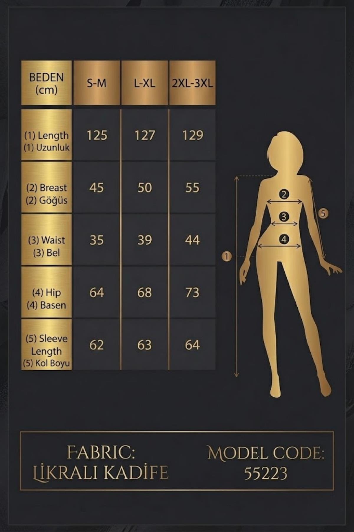 • Lüks Kumaş: Kış mevsiminin ve özel günlerin favorisi olan, yumuşak dokulu ve parlak kadife kumaş, ürüne lüks bir hava katar ve vücudu zarifçe sarmalar.