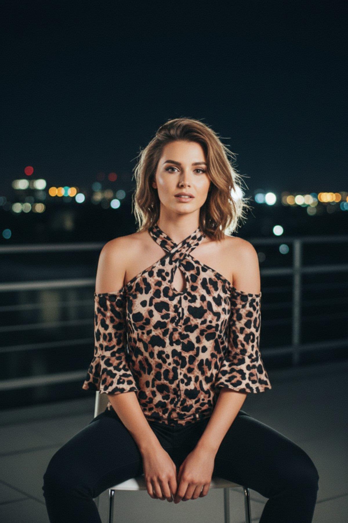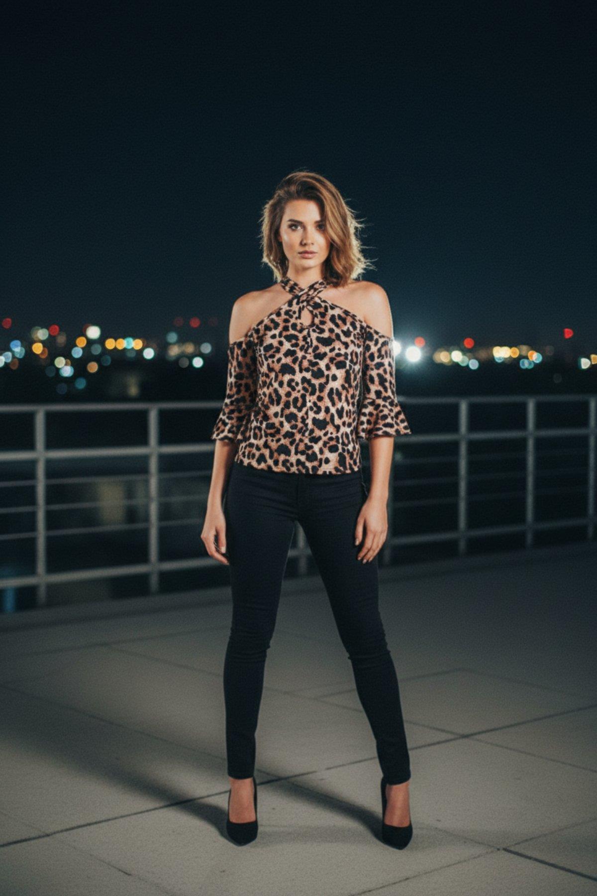 Gardırobunuzun en iddialı parçası olmaya aday bu bluz, klasik leopar desenini modern kesim detaylarıyla birleştiriyor. Halter yaka ve pencere detaylı göğüs dekoltesi, omuzları zarifçe açıkta bırakan cold-shoulder kesimiyle birleşerek sofistike bir görünüm sunuyor.