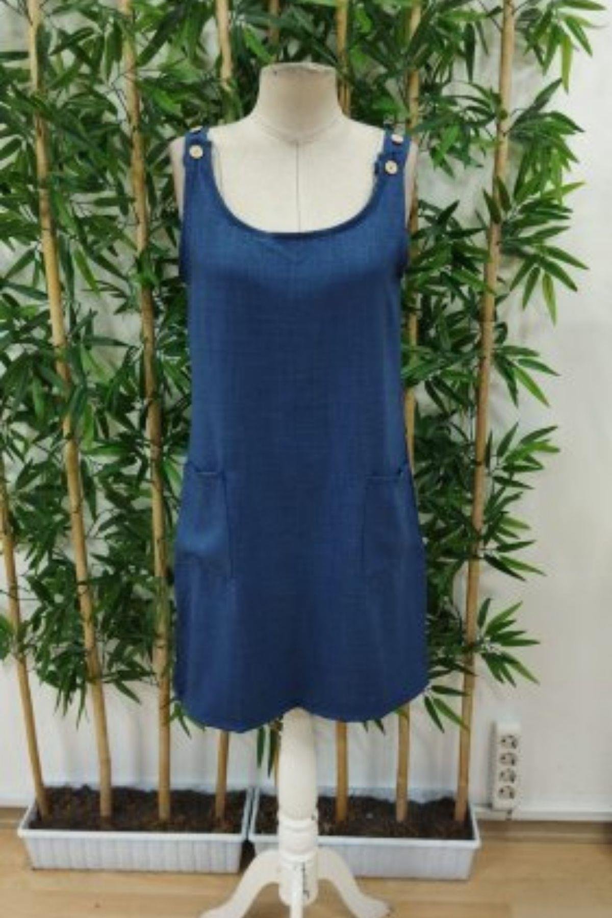 Cepli Ve Düğme Detaylı Omuz Askılı Keten Elbise - Mavi (JS61440-MAVİ)