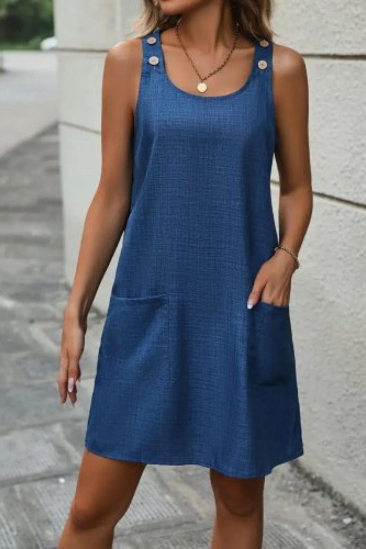 Cepli Ve Düğme Detaylı Omuz Askılı Keten Elbise - Siyah Cepli Ve Düğme Detaylı Omuz Askılı Keten Elbise - Mavi