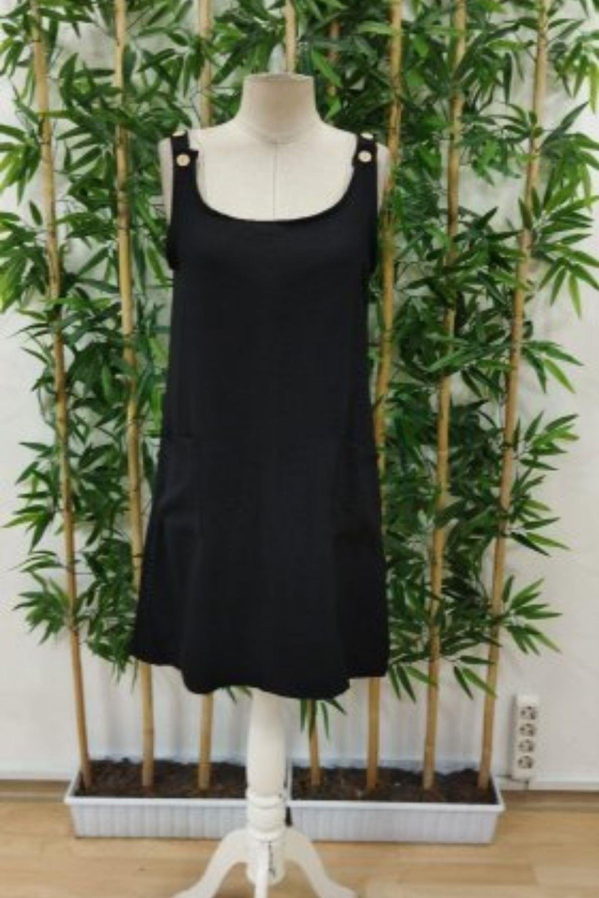 Cepli Ve Düğme Detaylı Omuz Askılı Keten Elbise - Siyah (JS61440-SİYAH)