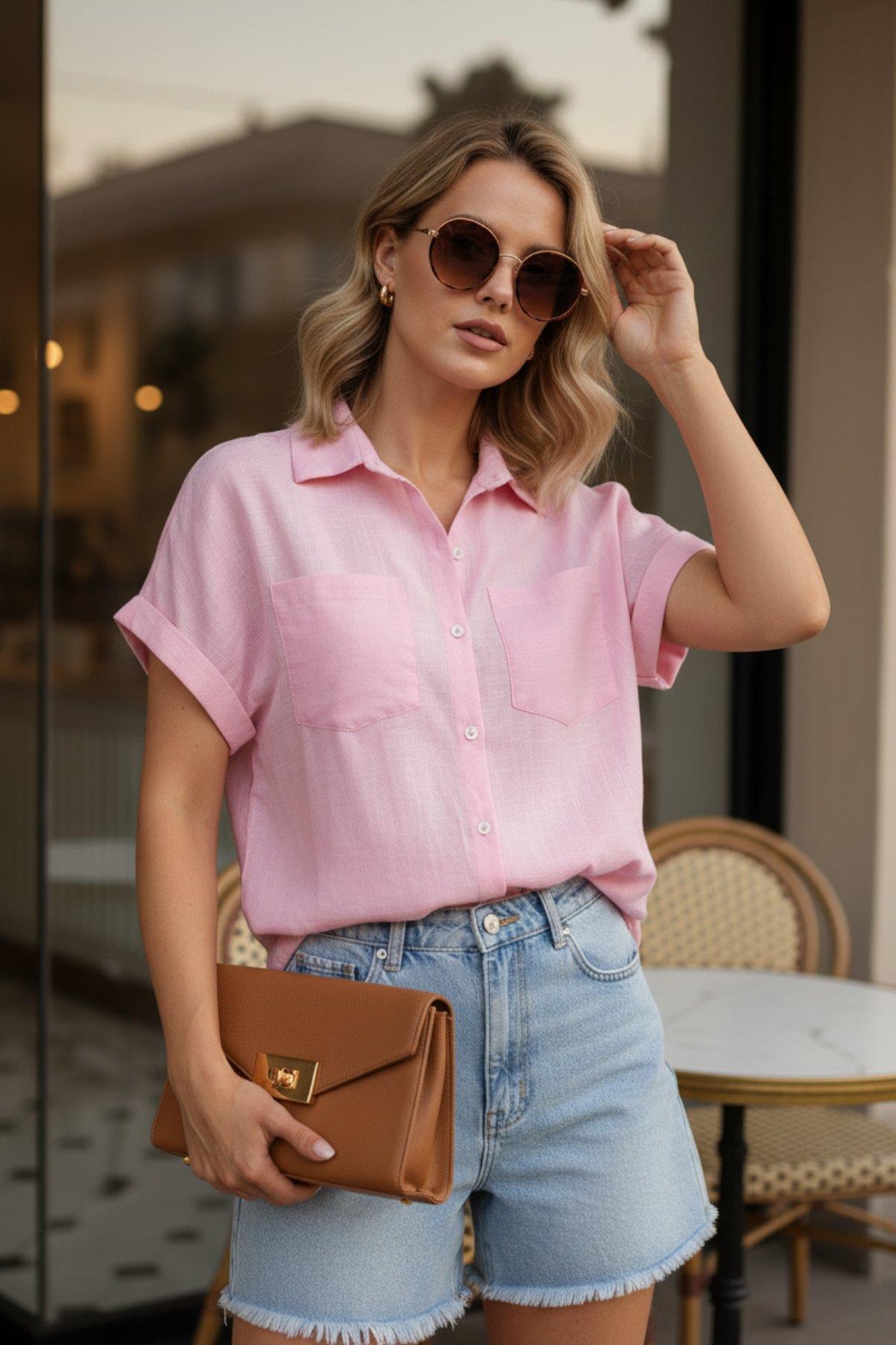 Çift Cepli Önden Düğmeli Gömlek - Pembe