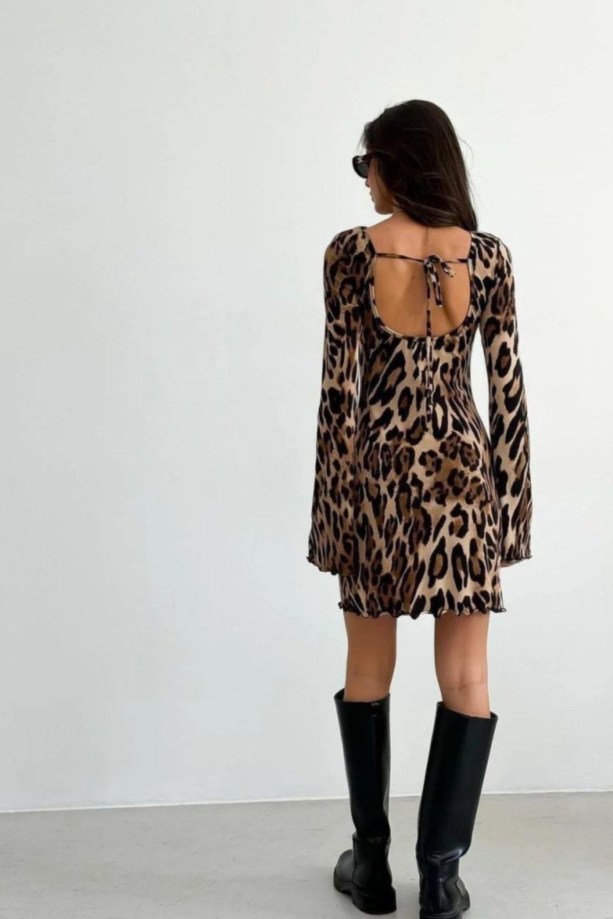 Leopar Desenli Sırt Dekolteli Mini Elbise