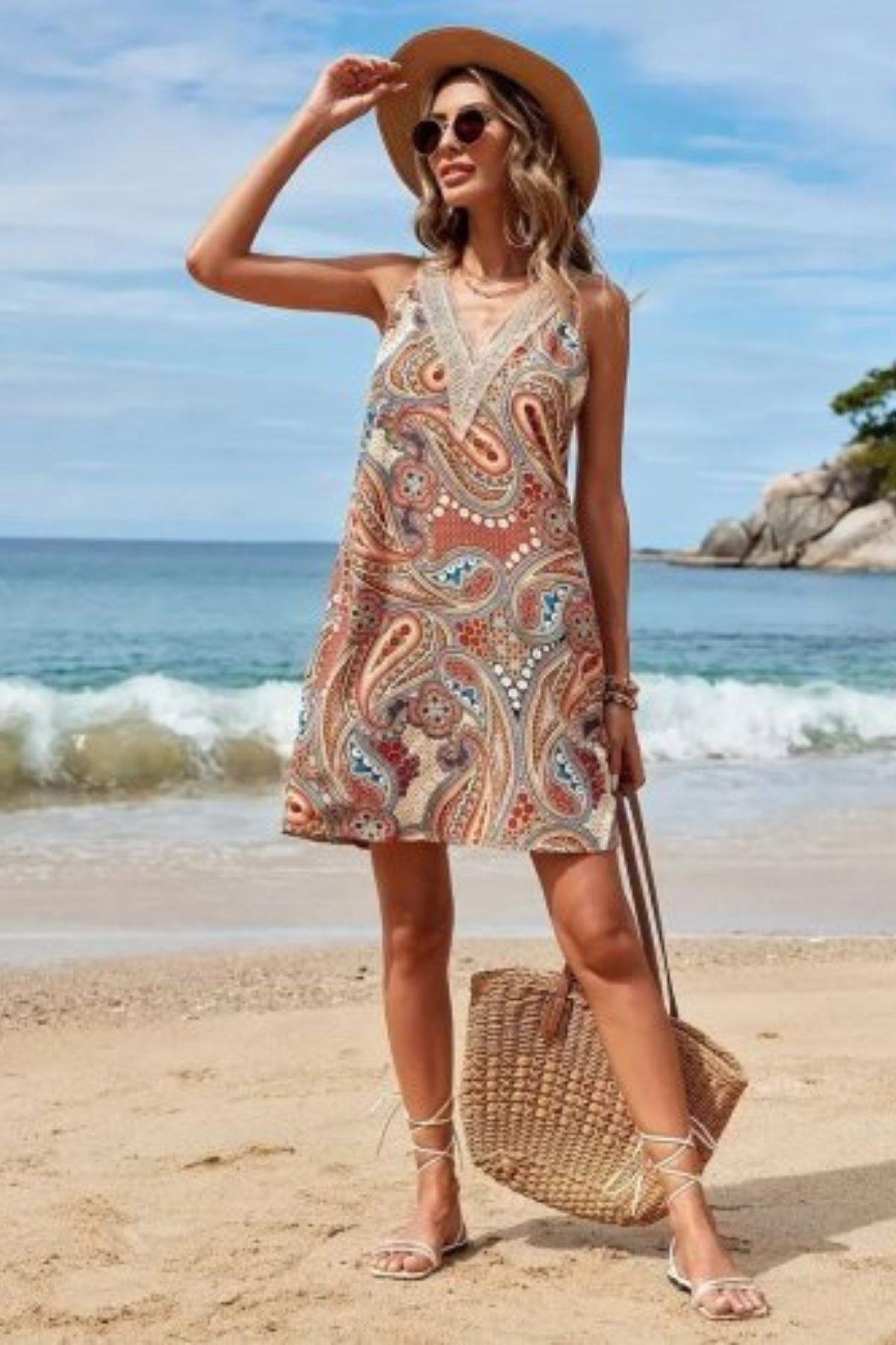 Yaz esintisini stilinize taşıyan bu V yaka askılı elbise ile plajdan şehre rahat ve şık bir geçiş yapın! Özgün ve canlı desenleriyle dikkat çeken bu elbise, tatil valizinizin vazgeçilmezi olacak. Hafif ve nefes alan kumaşı sayesinde sıcak yaz günlerinde bile maksimum konfor sunar. Rahat kesimiyle hareket özgürlüğü sağlarken, şık V yaka detayı ve askılı modeli feminen bir dokunuş katıyor. Plajda pareo olarak, şehirde sandaletler ve hasır bir şapka ile günlük stilinizde veya akşam üstü bir gezintide tercih edebilirsiniz. Çok yönlü kullanımıyla gardırobunuzun joker parçası olmaya aday bu elbise ile yazın keyfini çıkarın!