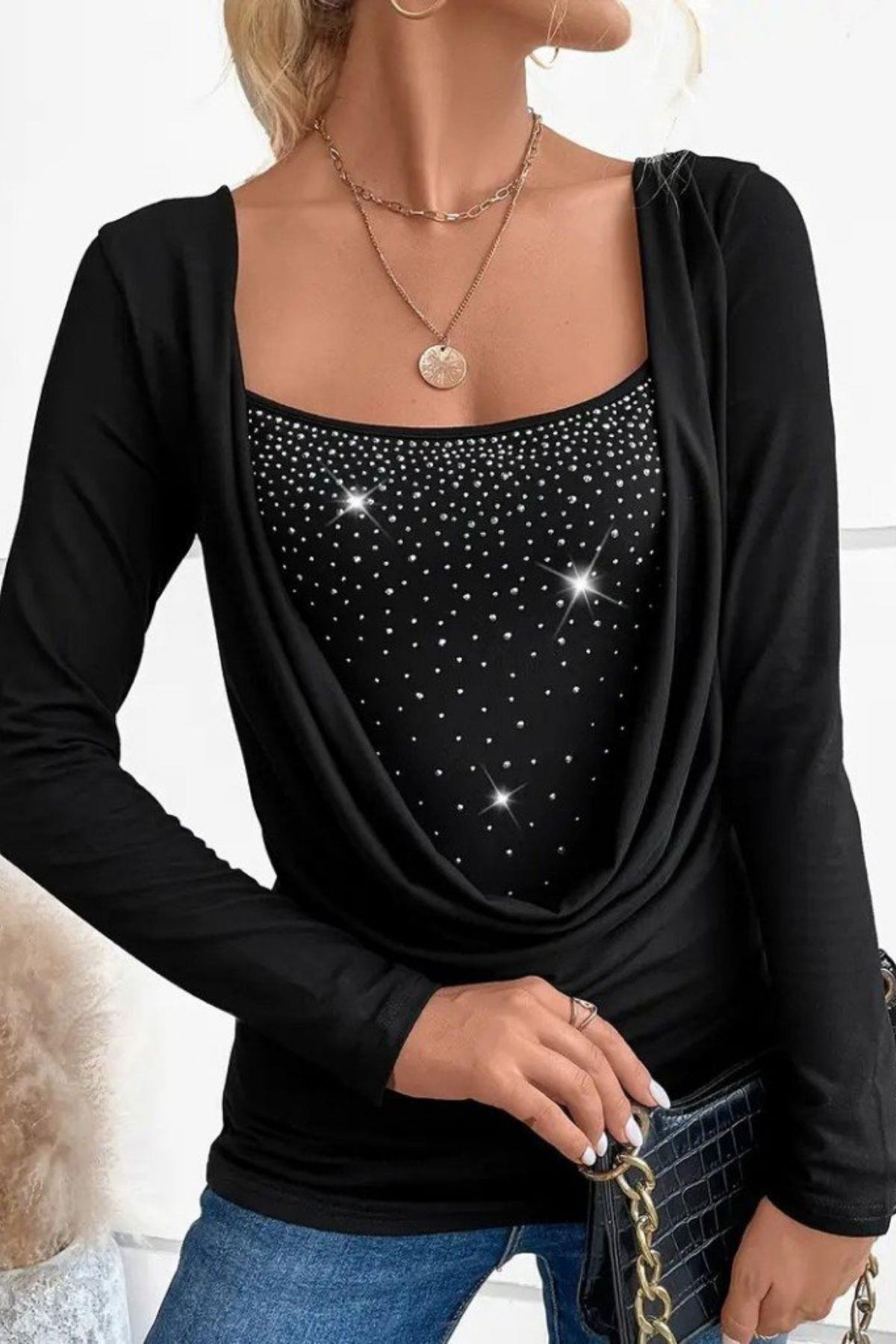 Bu ışıltılı ve drape detaylı bluz ile stilinize göz alıcı bir dokunuş katın! Uzun kollu ve kare yaka görünümlü tasarımıyla hem modern hem de zarif bir duruş sergiler. Ön kısmındaki parlak taş ve sim detayları, bluzu sade bir parçadan özel bir parçaya dönüştürür. Esnek ve rahat kumaşı sayesinde gün boyu konforlu bir kullanım sunar. Günlük jeanlerinizden şık pantolon veya eteklerinize kadar birçok farklı kombinle uyum sağlar. Gecenin parlayan yıldızı olmak için bu bluz tam size göre!
