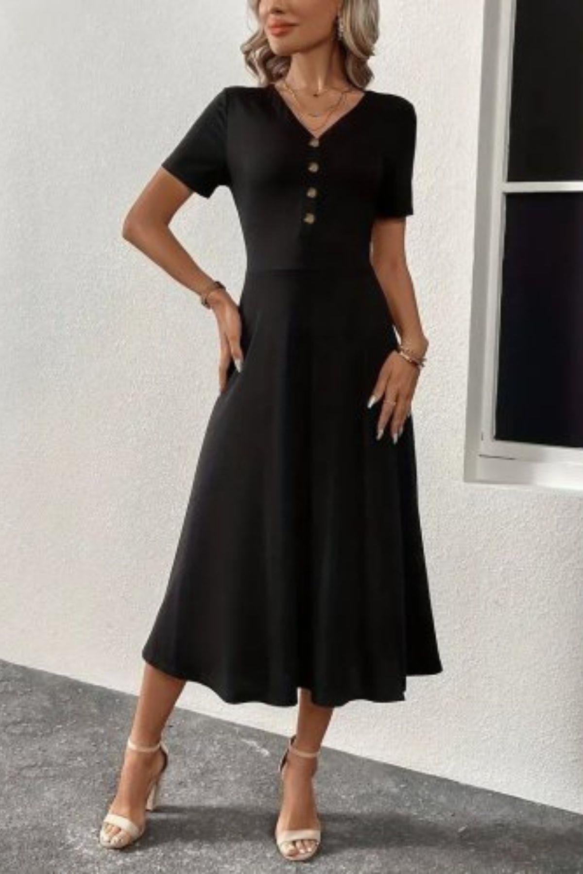 Düğme Detaylı V Yaka Kısa Kollu Midi Elbise - Siyah