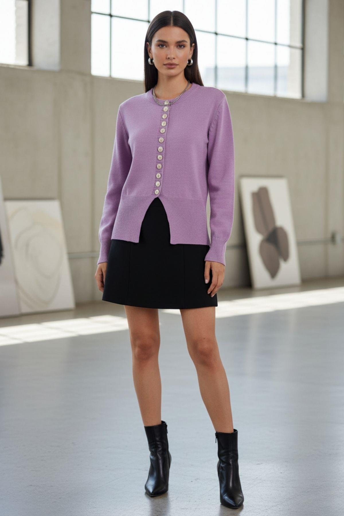 Düğmeli Asimetrik Kesim Triko Hırka - Lila (NS2504NEW-LİLA)