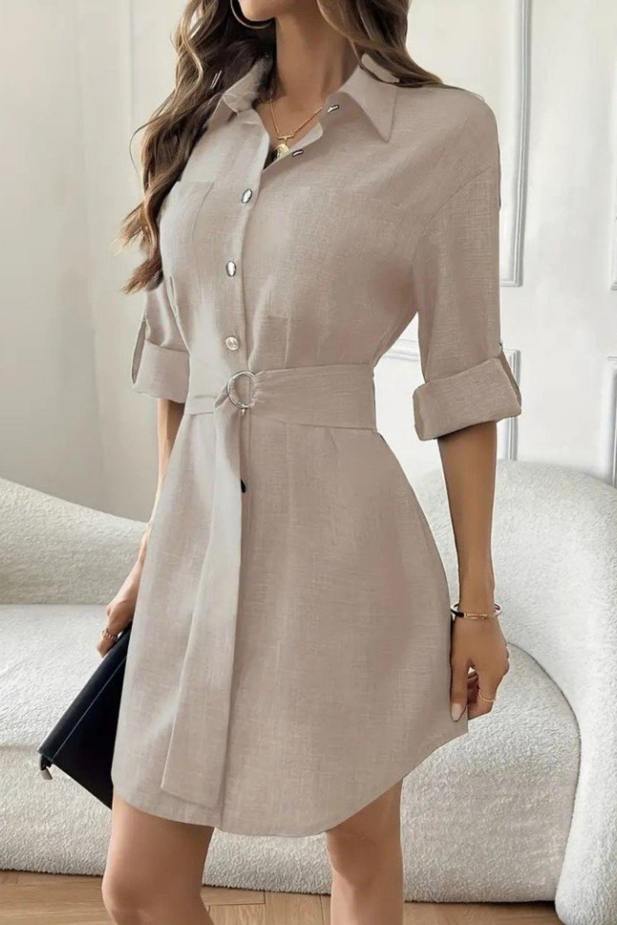 Doğal ve modern bir duruş sergileyen bu Gömlek Elbise ile stilinize yalın bir zarafet katın. Konforlu kumaşı ve nefes alan yapısıyla gün boyu rahat bir kullanım sunar. Beldeki zarif kemer detayı, silüetinizi vurgulayarak şık bir görünüm sağlar. İster spor ayakkabıyla casual, ister topuklu ayakkabıyla şık bir şekilde kombinleyebileceğiniz bu çok yönlü parça, gardırobunuzun joker elemanı olmaya aday. Düğmeli ön tasarımı ve katlanabilir kollarıyla her mevsimin favorisi.