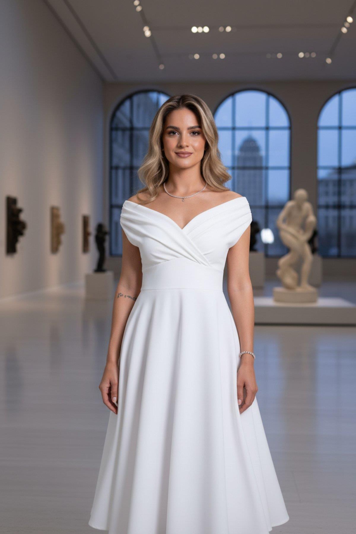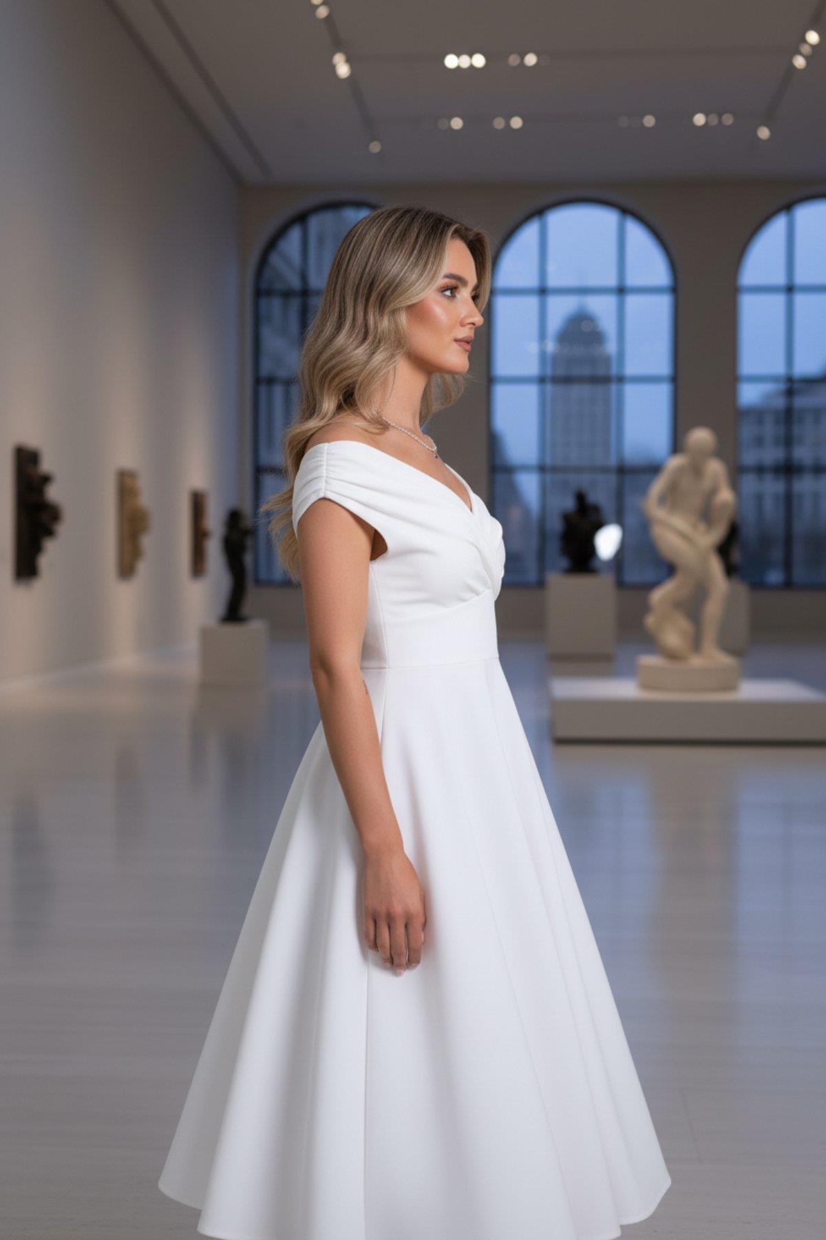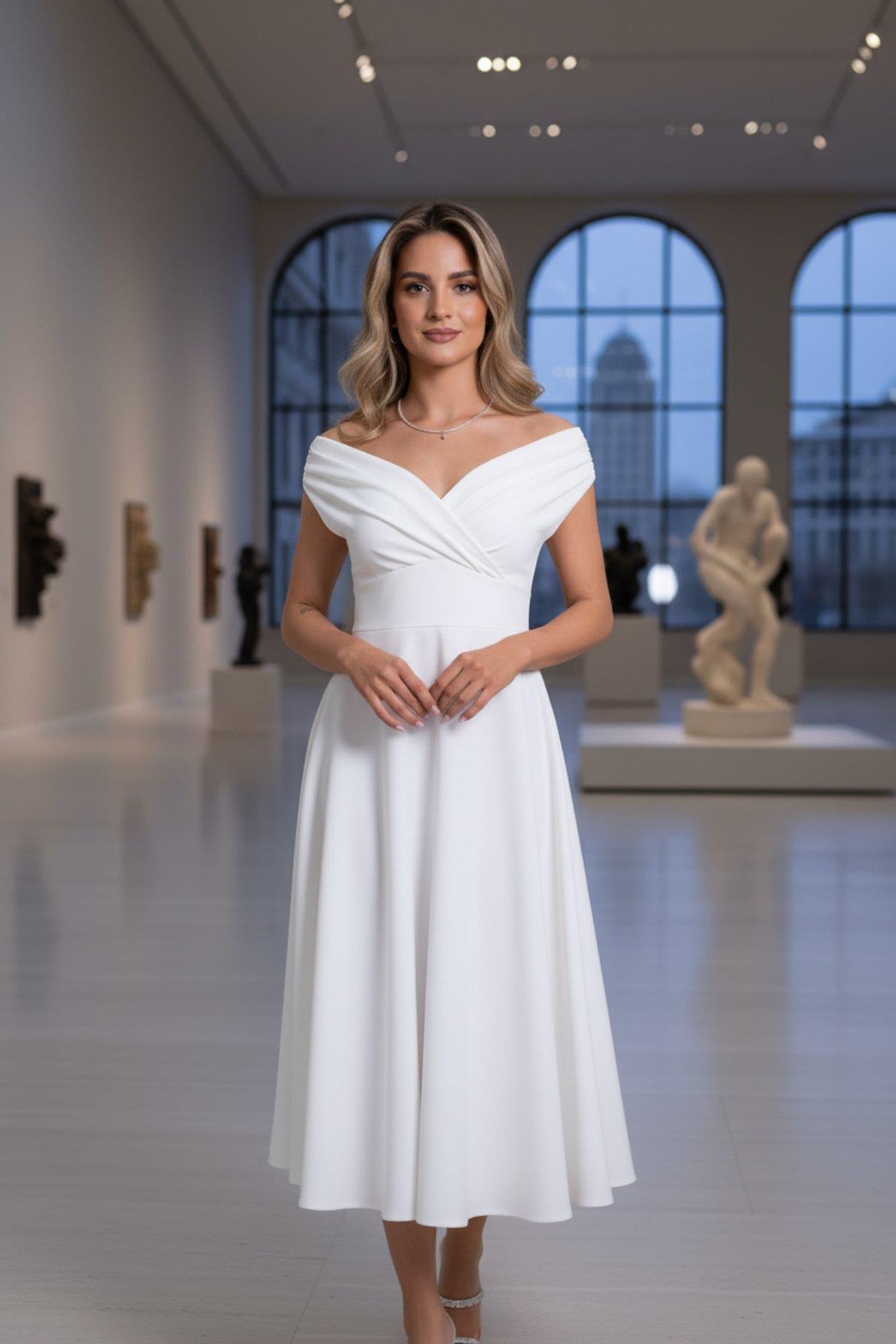 Düşük Omuz Eteği Volanlı Krep Elbise - Beyaz