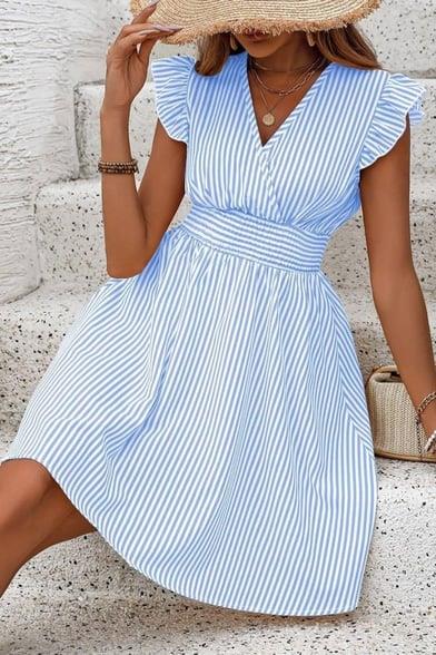 Fırfırlı Kol Detaylı Çizgili Mini Elbise - Mavi