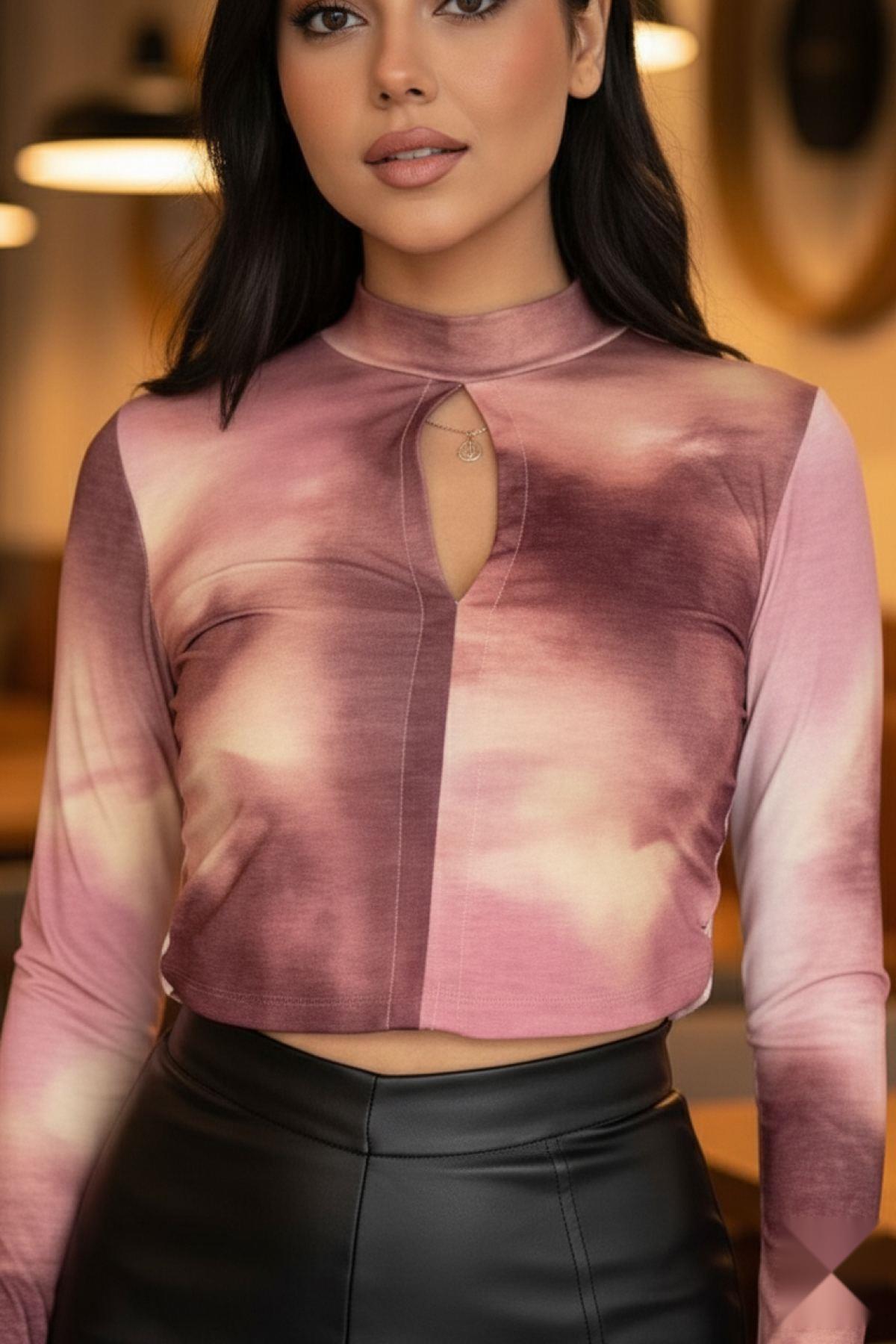 Göğüs Pencereli Ayarlanabilir Büzgülü Dijital Bluz Pudra (LE3695-PUDRA)