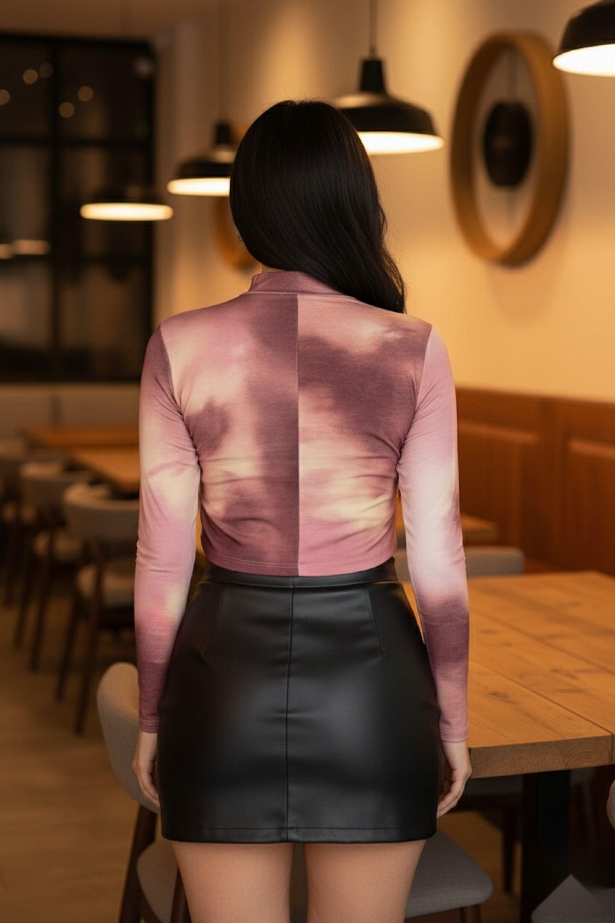 Göğüs Pencereli Ayarlanabilir Büzgülü Dijital Bluz Pudra