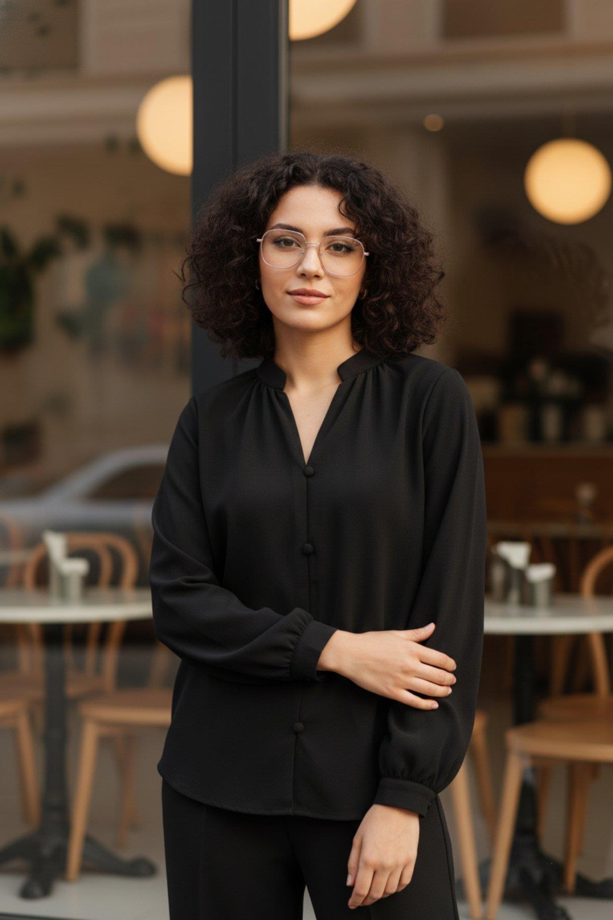 Hakim Yaka Düğmeli İthal Krep Bluz - Siyah