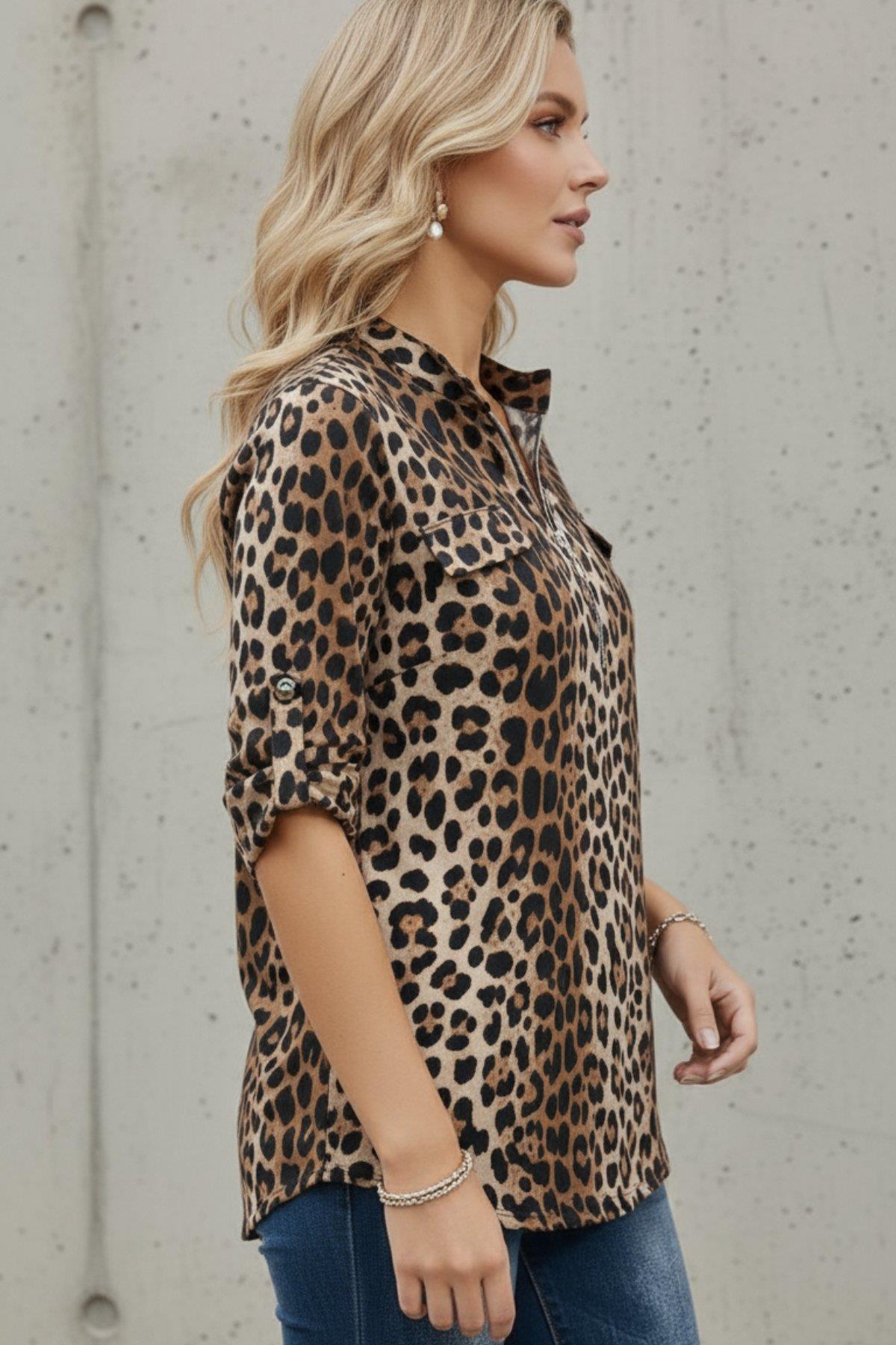 Leopar Desenli Yarım Fermuarlı Cepli Bluz