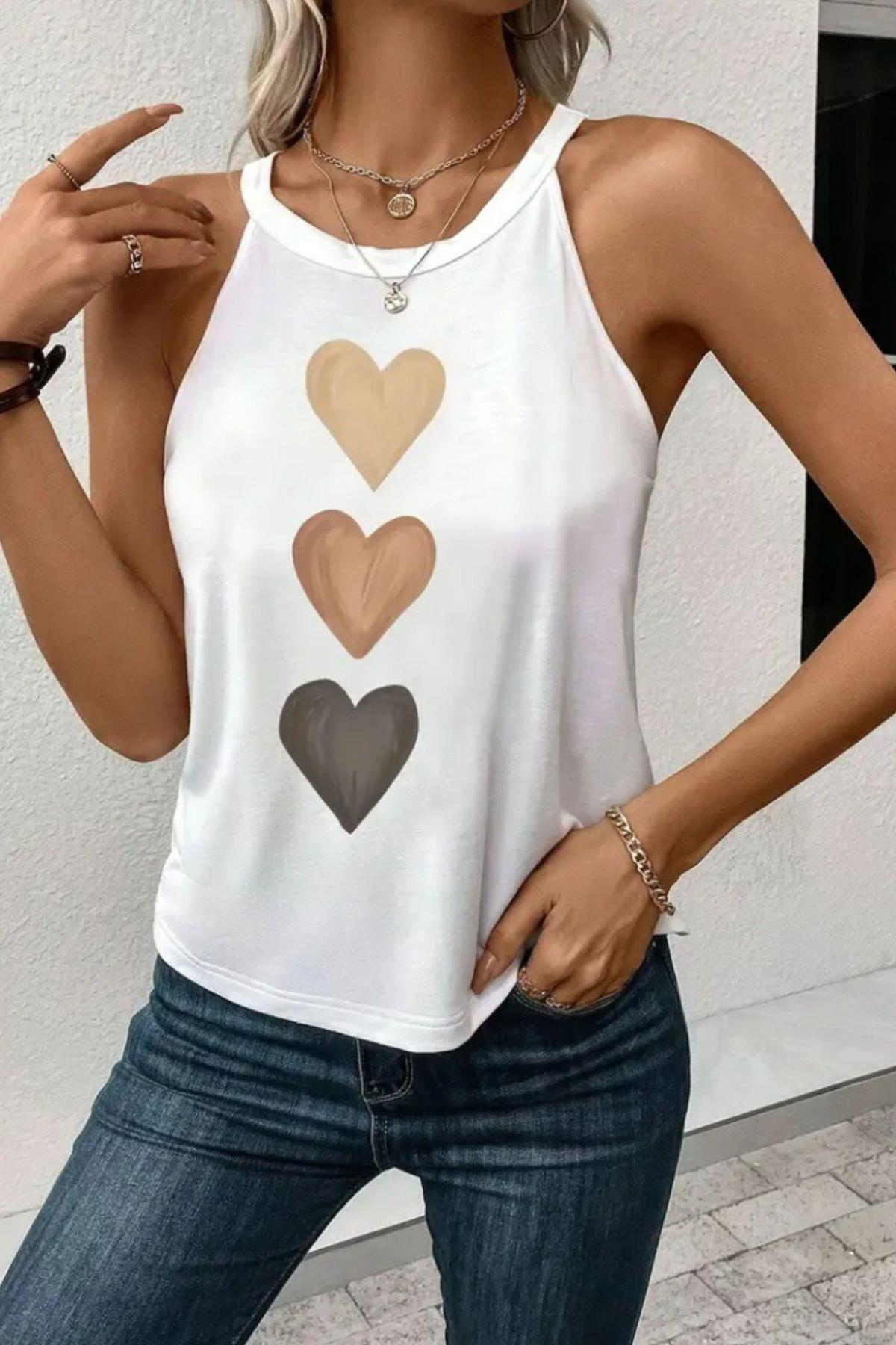 Halter Yaka Kalp Desen Viskon Bluz Beyaz