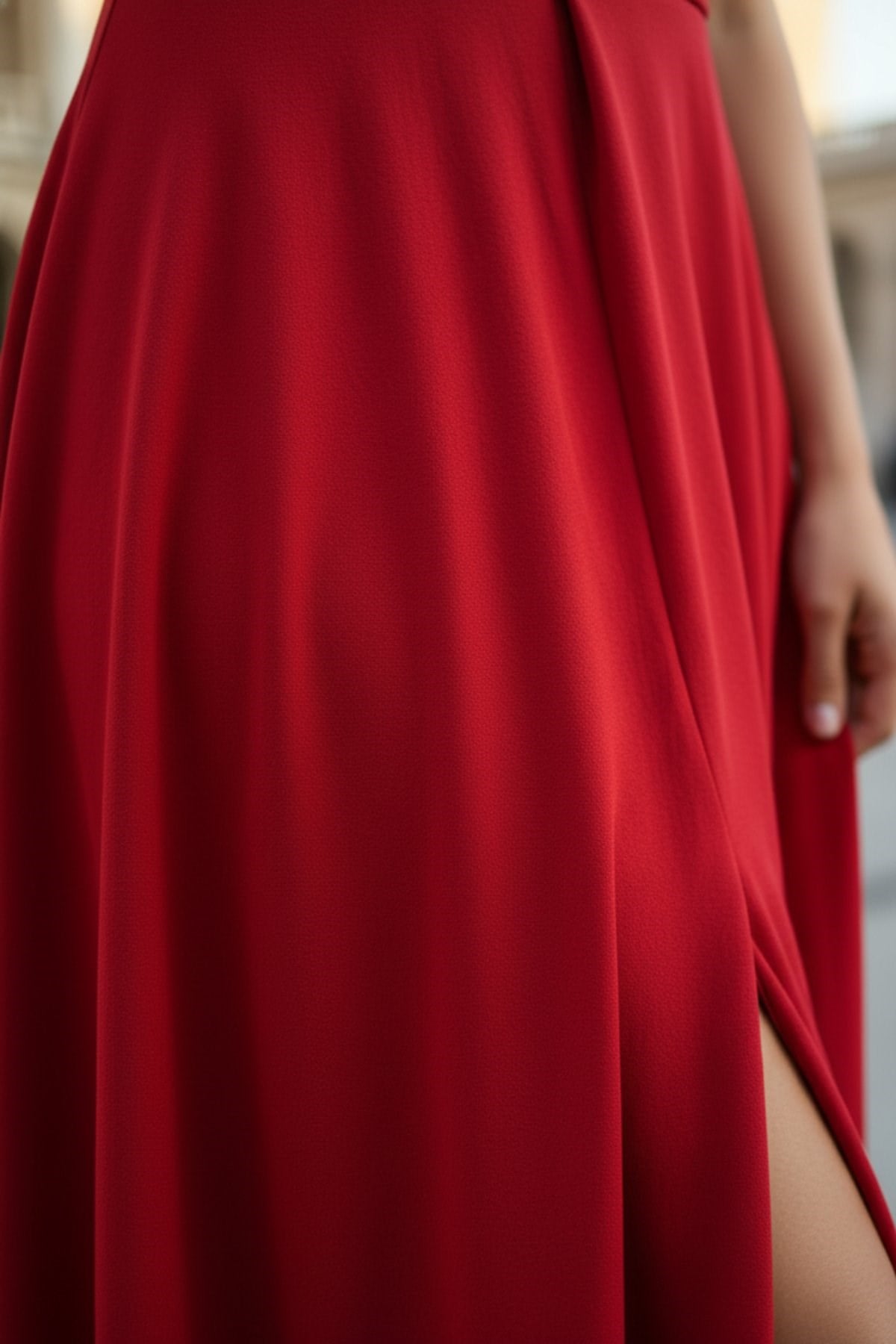 İnce Askılı Kruvaze Yaka Yırtmaçlı İthal Krep Elbise - Kırmızı (JS62109-KIRMIZI)