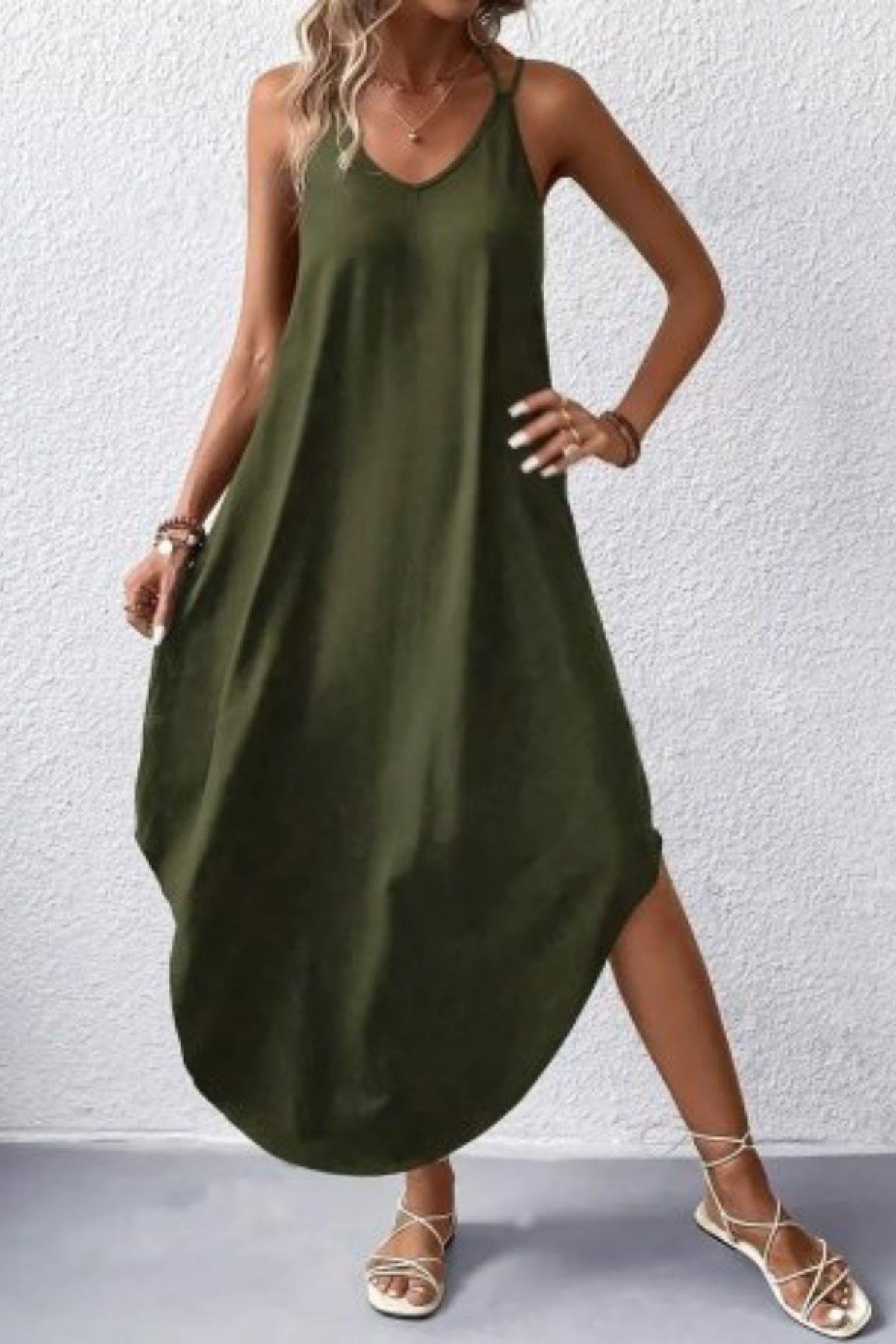 İnce Askılı V Yaka Salaş Viskon Elbise - Yeşil