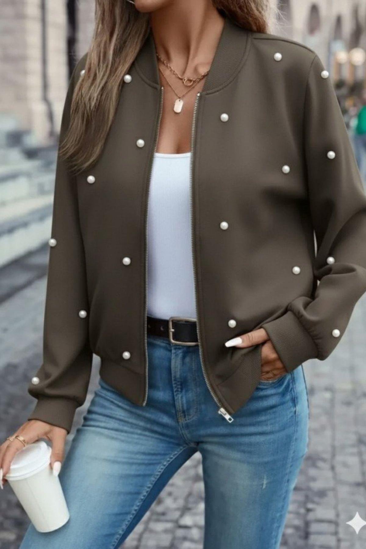 İnci Detaylı Fermuarlı Modal Ceket  - Siyah İnci Detaylı Fermuarlı Modal Ceket  - Vizon