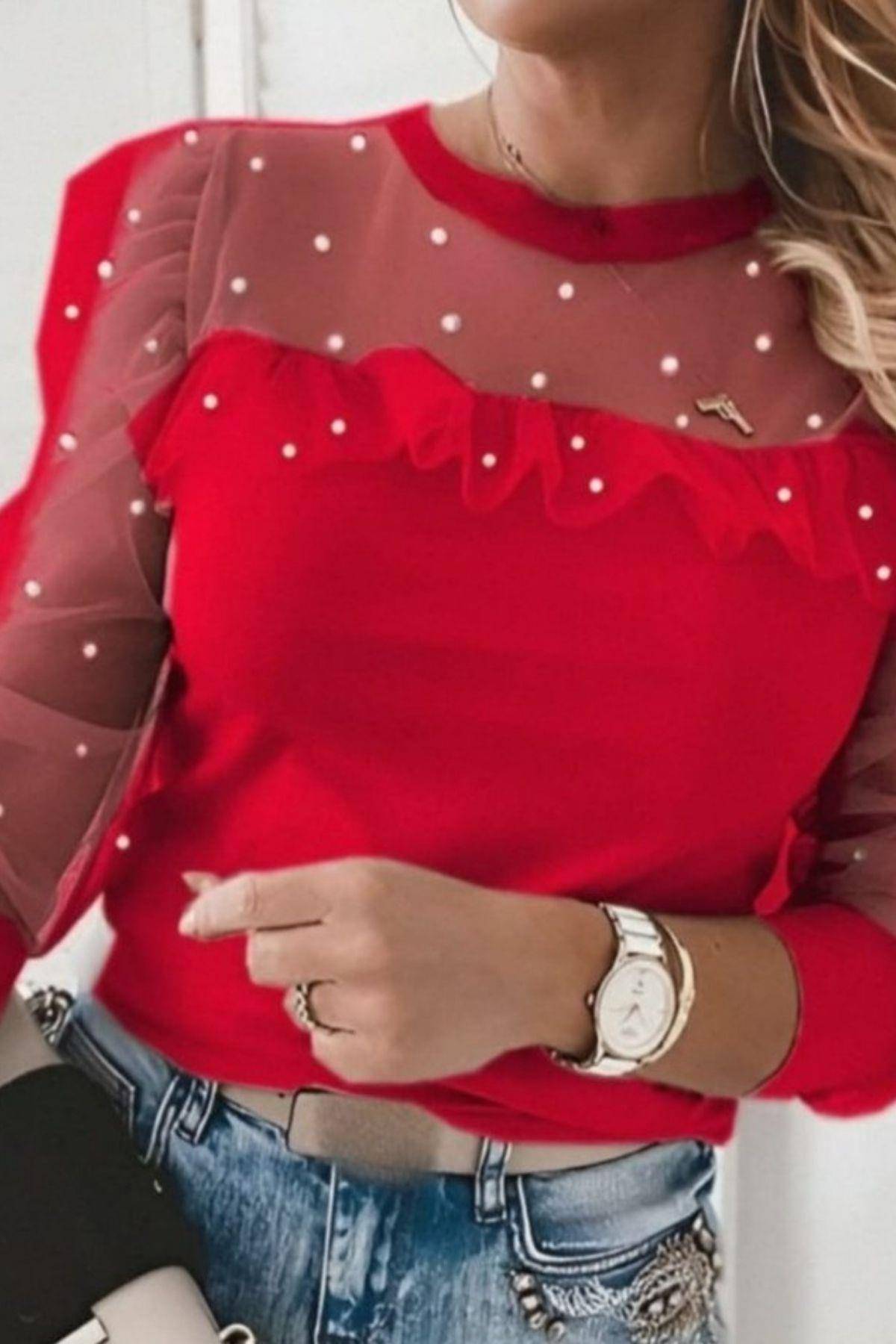 İnci Detaylı Tül Kollu Viskon Bluz - Kırmızı (JS71354-KIRMIZI)