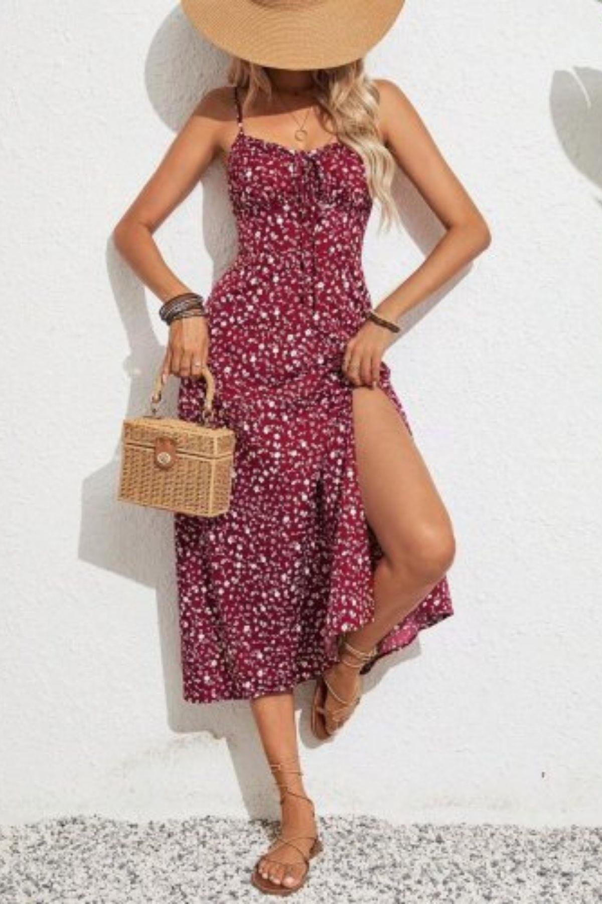 İp Askılı Bağcıklı  Yandan Yırtmaçlı Süprem Elbise - Bordo