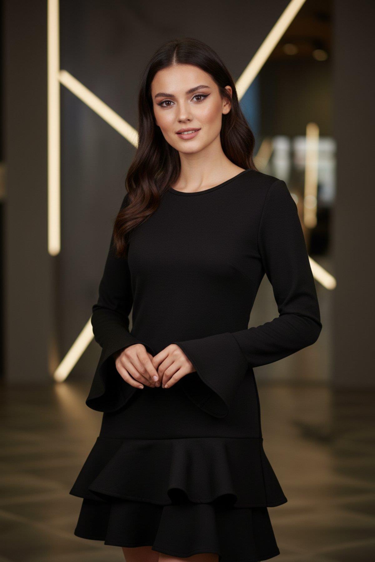 Şıklığı ve rahatlığı birleştiren bu özel tasarım mini elbise ile tarzınızı zirveye taşıyın. Fitilli (Ribana) esnek kumaşı sayesinde vücuda tam oturan fit kesimi ile zarif hatlarınızı ön plana çıkarır. Bisiklet yaka detayı ile sadeliği korurken, asıl dikkat çekici unsur, hareketli trompet (ispanyol) kol kesimi ve etek ucunu saran volanlı fırfır detaylarıdır. Özel davetlerden şık bir akşam yemeğine, hatta iddialı günlük kombinlere kadar her ortama uyum sağlayabilir. Uzun çizmeler veya topuklu ayakkabılarla kombinleyerek göz alıcı bir stil yaratın.