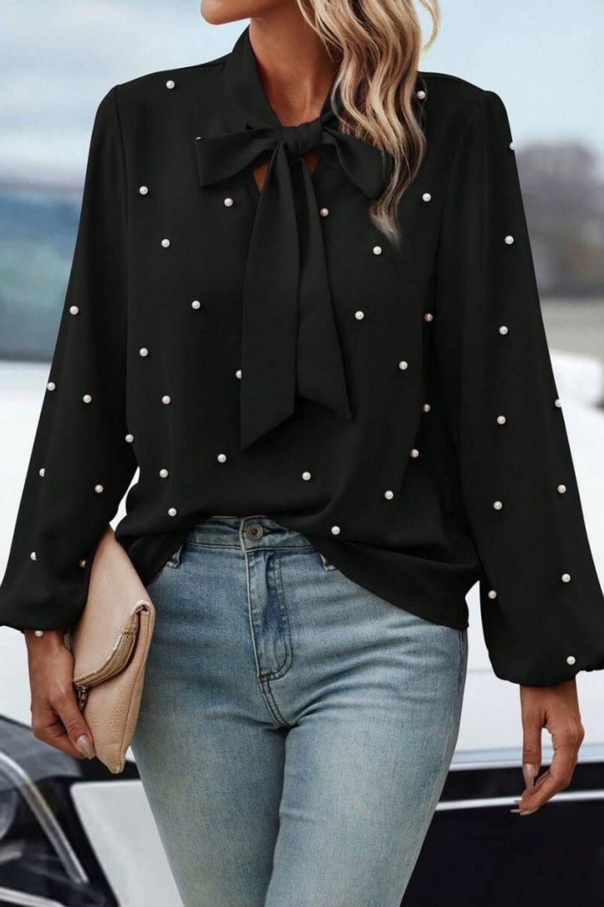 İthal Krep Kumaş İnci Detaylı Fiyonk Yaka Bluz - Siyah