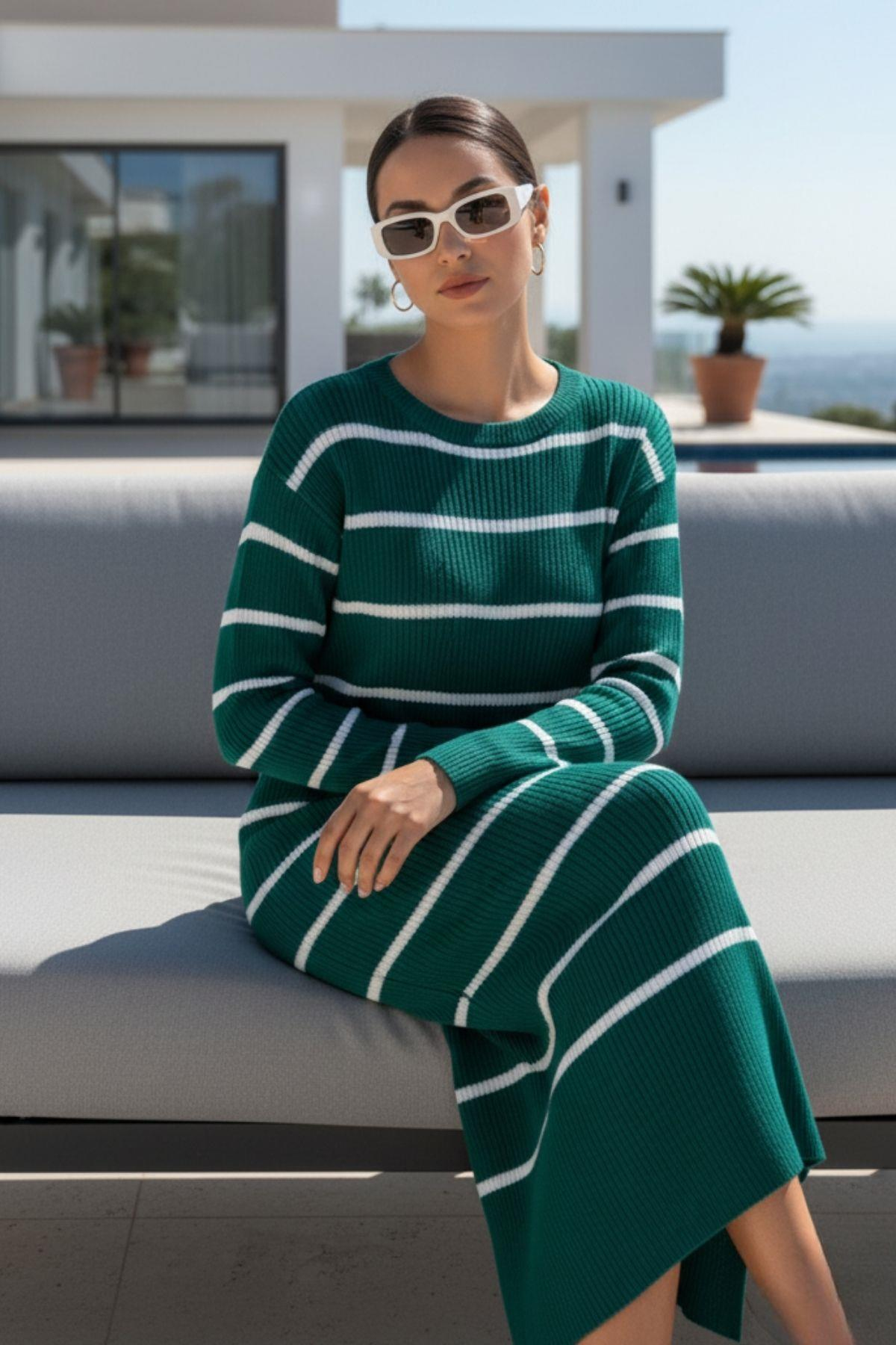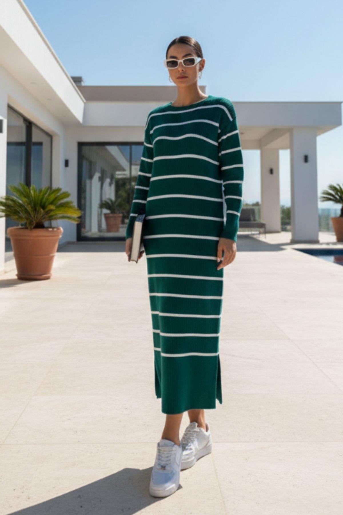 Kadın Çizgili Triko Uzun Elbise – Doğal Tarz, Rahat Fit, Yırtmaç Detaylı – Yeşil (DG5520-YEŞİL)