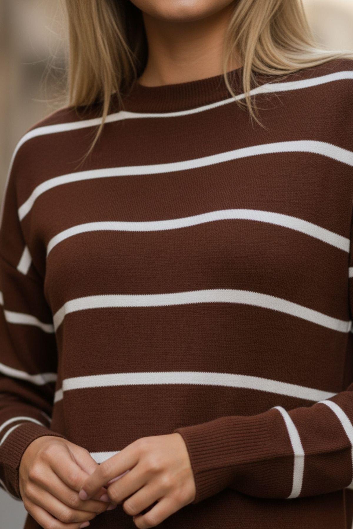 Kadın Çizgili Triko Uzun Elbise – Günlük Konfor, Sıcak Ton, Yırtmaç Detaylı – Kahve (DG5520-KAHVE)