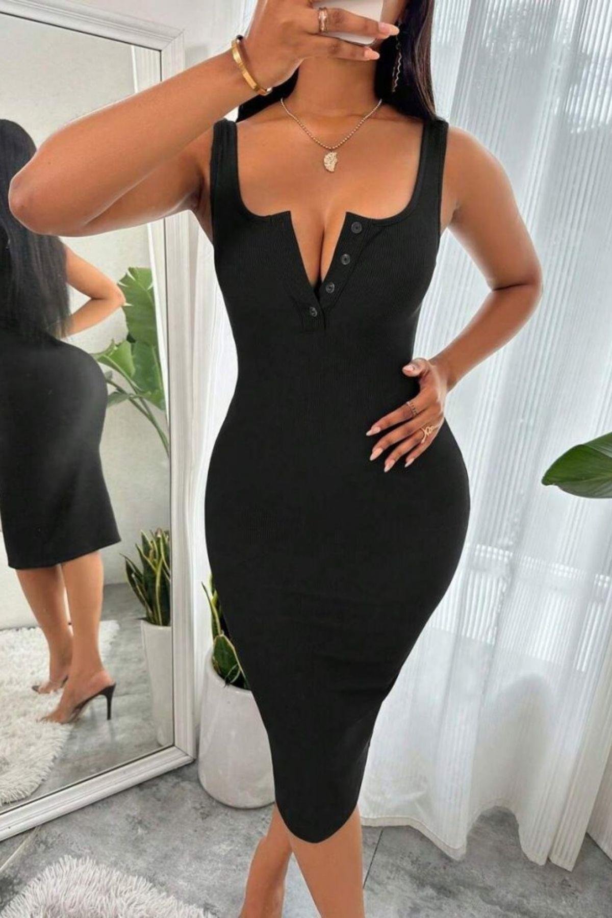 Vücudu kusursuzca saran, modern tasarımıyla dikkat çeken bu kadın elbisesi, gardırobunuzun vazgeçilmezi olacak. Derin V yaka ve düğme detaylarıyla zarif bir görünüm sunar.